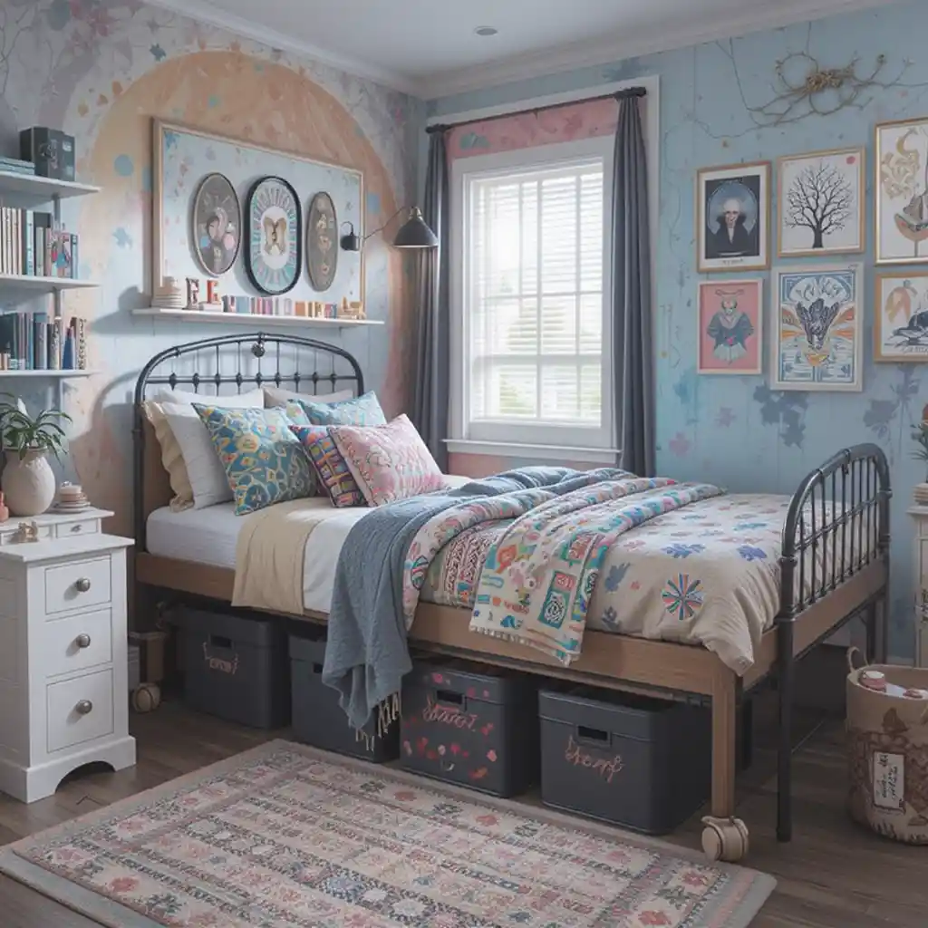 Use rolling bins, drawers, or lift-up beds to hide clutter while keeping the space neat. This idea works especially well in smaller teen bedrooms. Teen Bedroom Ideas
