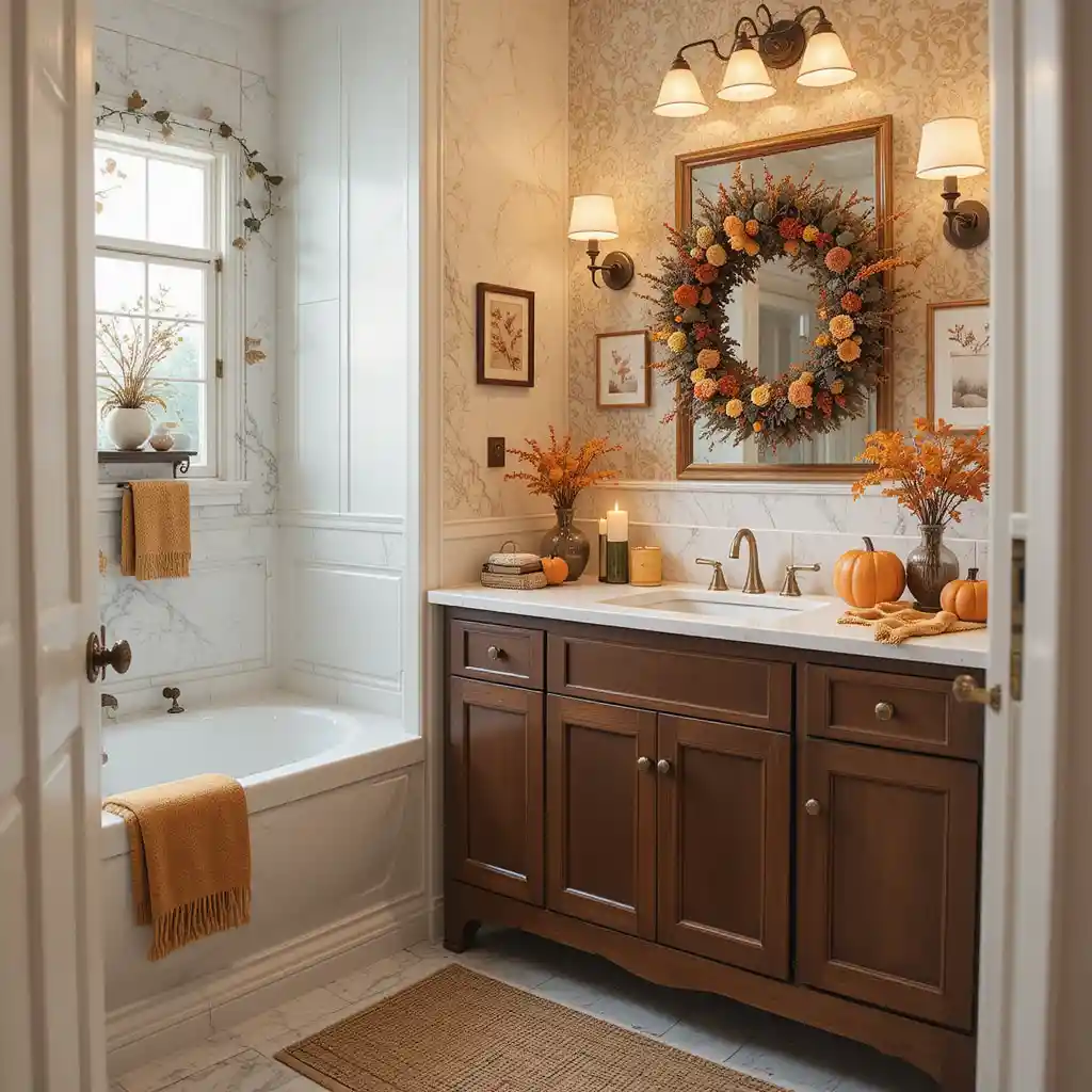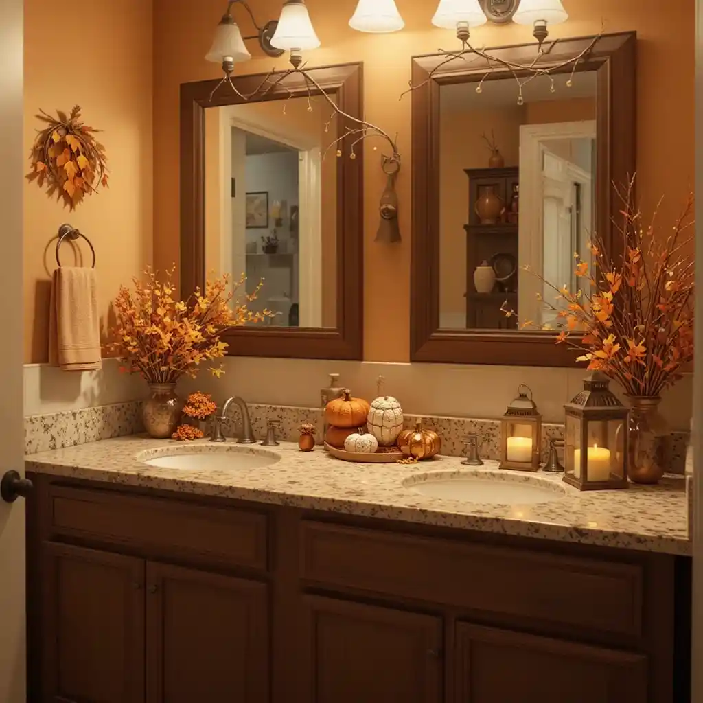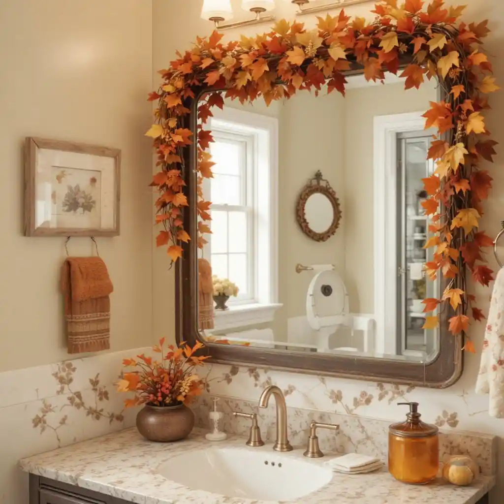 Frame your bathroom mirror with a garland made of autumn leaves or berries. It brings color and warmth to the space. Thanksgiving Bathroom Décor