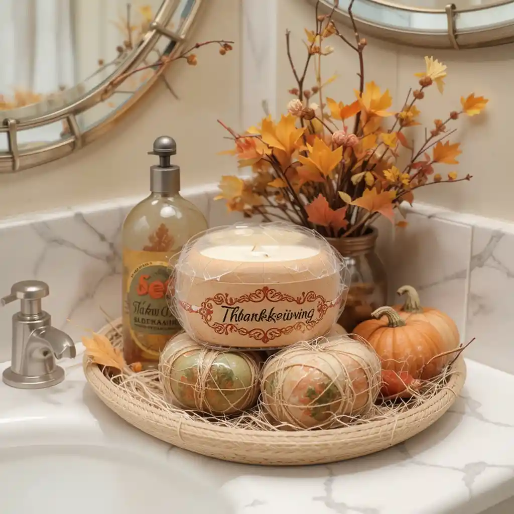 Incorporate gold soap dishes, towel rings, or trays. Metallics add elegance and pair beautifully with Thanksgiving colors.