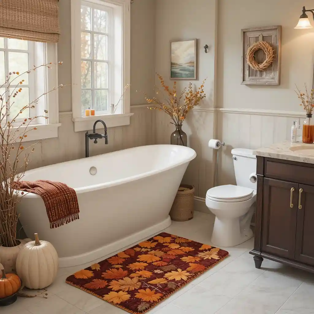 Choose bath mats in rich autumn shades like burnt orange, mustard yellow, or burgundy. They instantly bring seasonal warmth. Thanksgiving Bathroom Décor