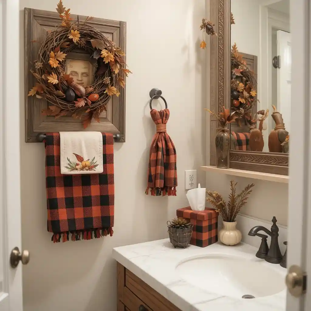 Use plaid towels, tissue box covers, or fabric baskets. Plaid instantly adds a rustic farmhouse Thanksgiving style. Thanksgiving Bathroom Décor