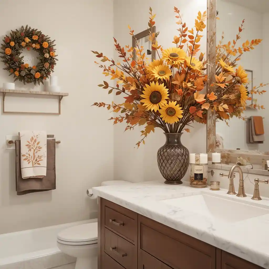 Place floral arrangements with sunflowers, mums, or faux leaves in a vase. They brighten the bathroom and tie in with Thanksgiving colors.