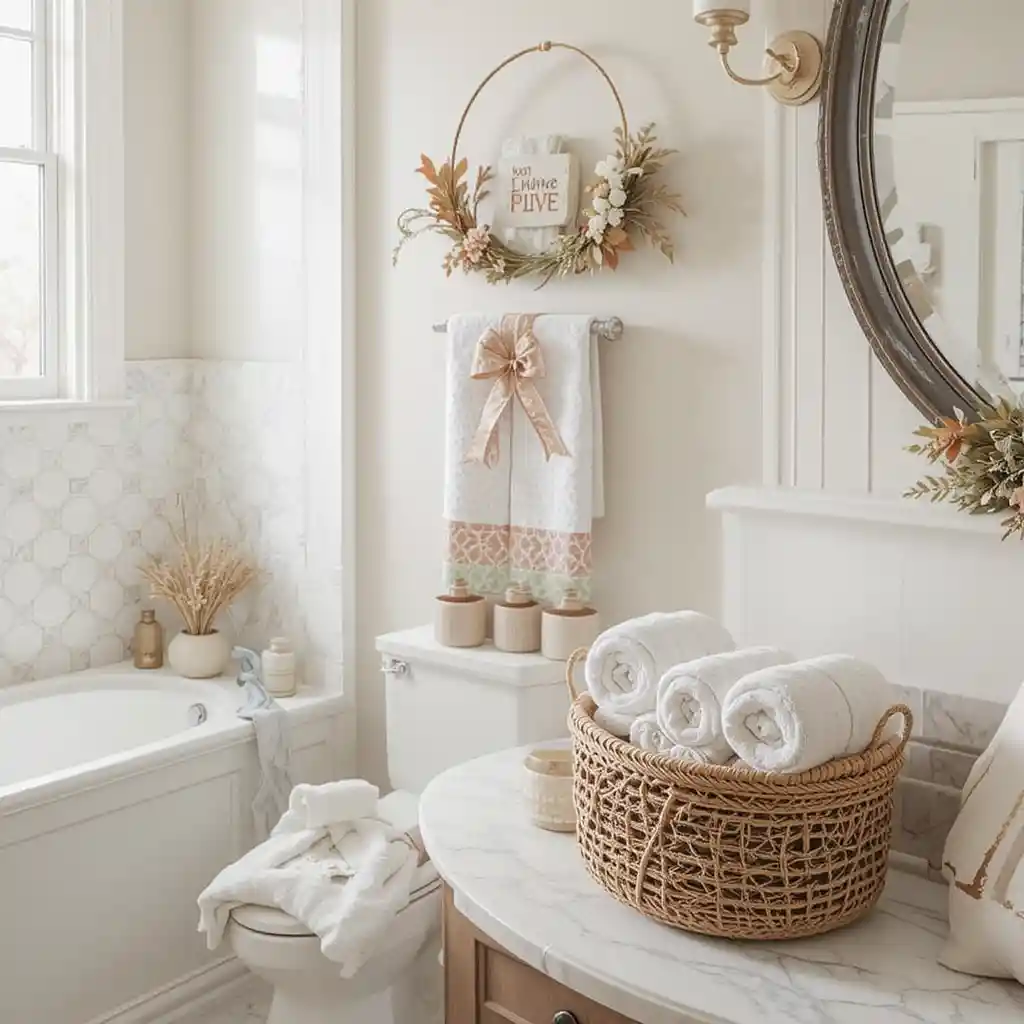 Thanksgiving Bathroom Décor most people think about dining rooms and kitchens, but the bathroom décor often gets overlooked. Adding seasonal touches to your bathroom makes the whole home feel festive and welcoming for guests. From autumn-inspired colors to small decorative accents, you can transform this space with cozy and stylish details. Here are 22 Thanksgiving bathroom ideas that will make your holiday celebration even more inviting.