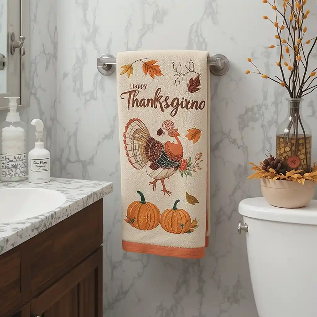 Swap everyday towels for holiday-themed hand towels with turkeys, pumpkins, or autumn leaves. They add charm while being functional. Thanksgiving Bathroom Décor