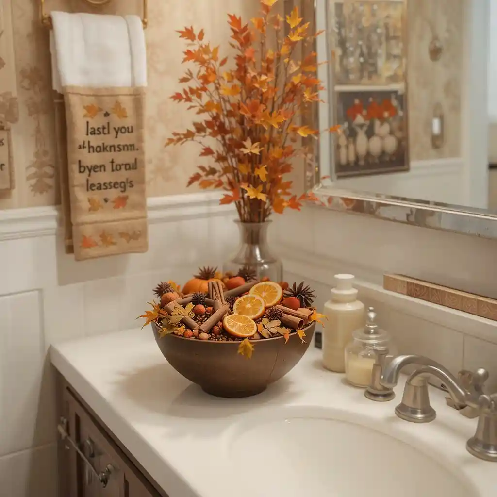 Place bowls of potpourri with cinnamon sticks, dried leaves, and orange slices in your bathroom. It keeps the room smelling fresh and festive. Thanksgiving Bathroom Décor