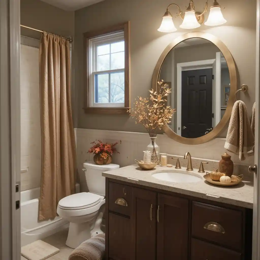 Hang autumn leaf prints or rustic wall art in warm colors. This simple addition creates a seasonal theme without overwhelming the space. Thanksgiving Bathroom Décor