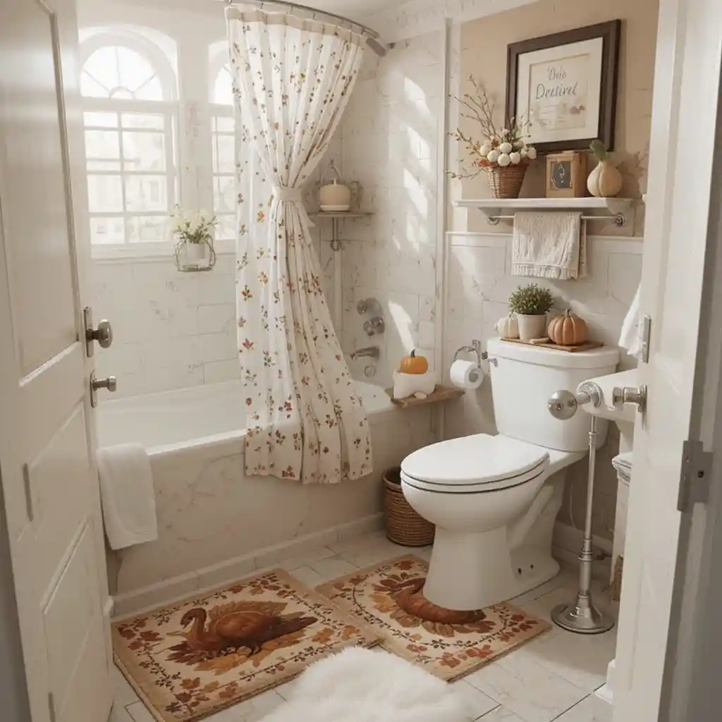 Lay down a Thanksgiving-themed rug with turkey or fall leaf patterns. It keeps the space functional while adding a seasonal touch. Thanksgiving Bathroom Décor