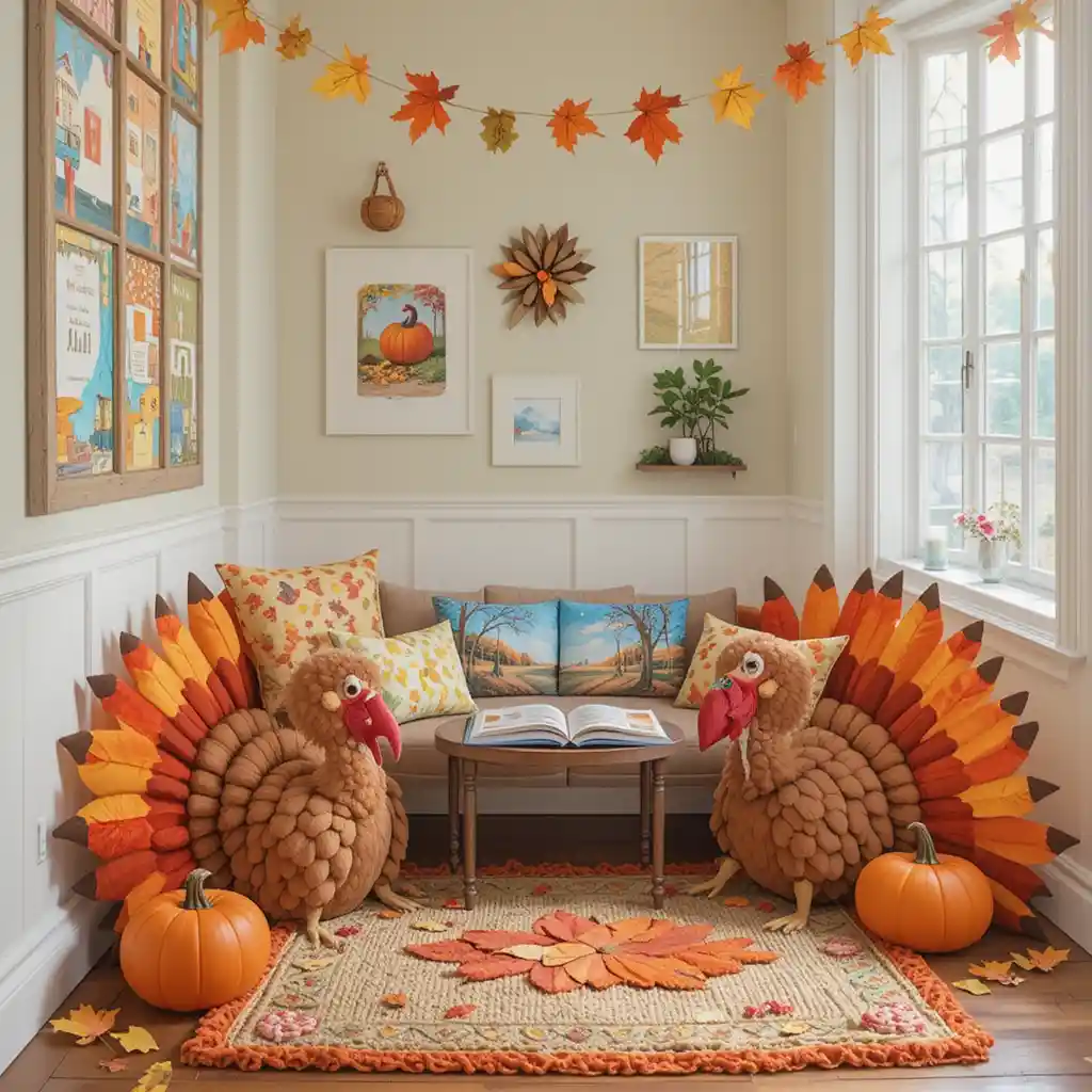Create a cozy reading area with turkey-shaped pillows, pumpkin rugs, and Thanksgiving storybooks to entertain kids before dinner.