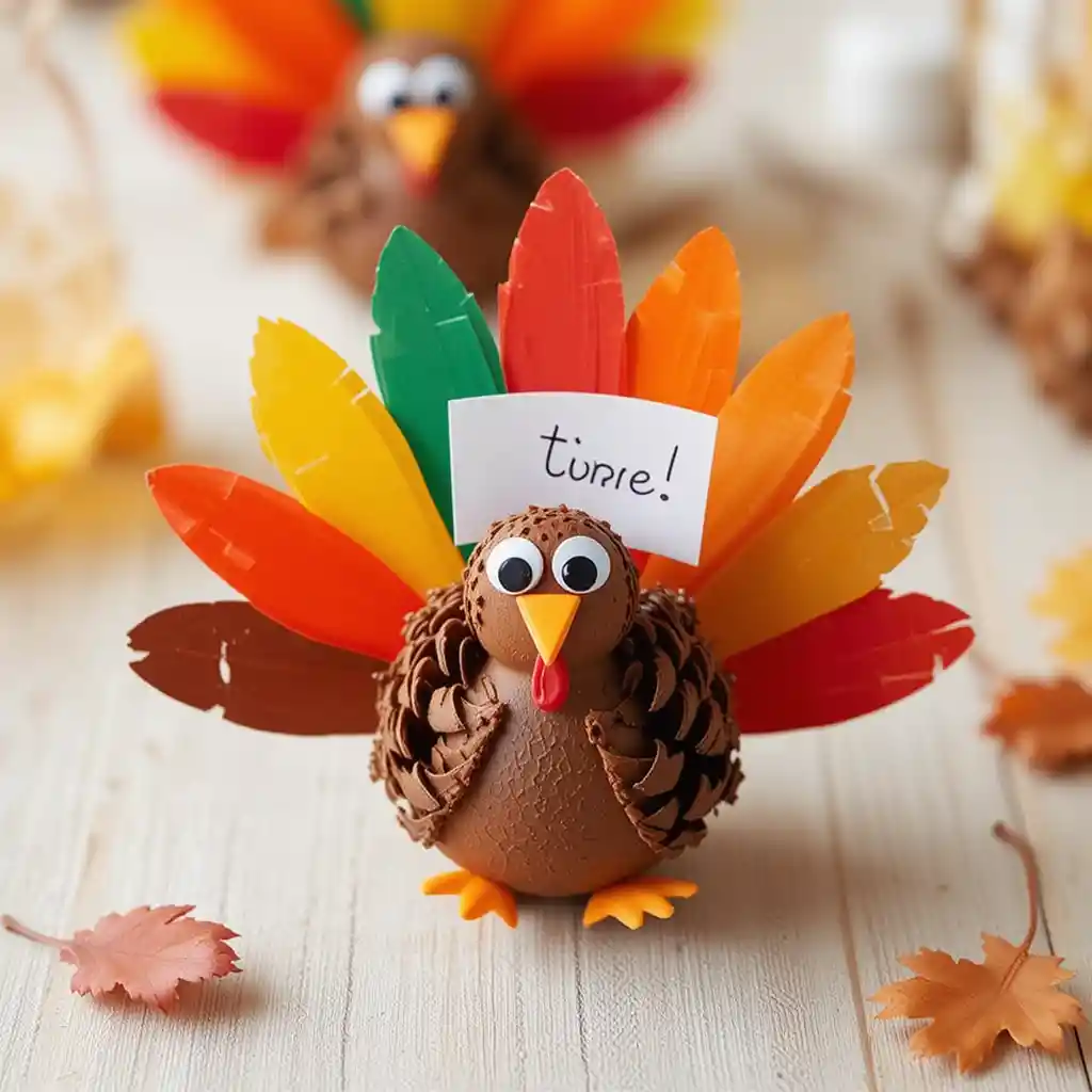 Attach paper feathers and googly eyes to pinecones, then add guest name tags for a playful table setting.