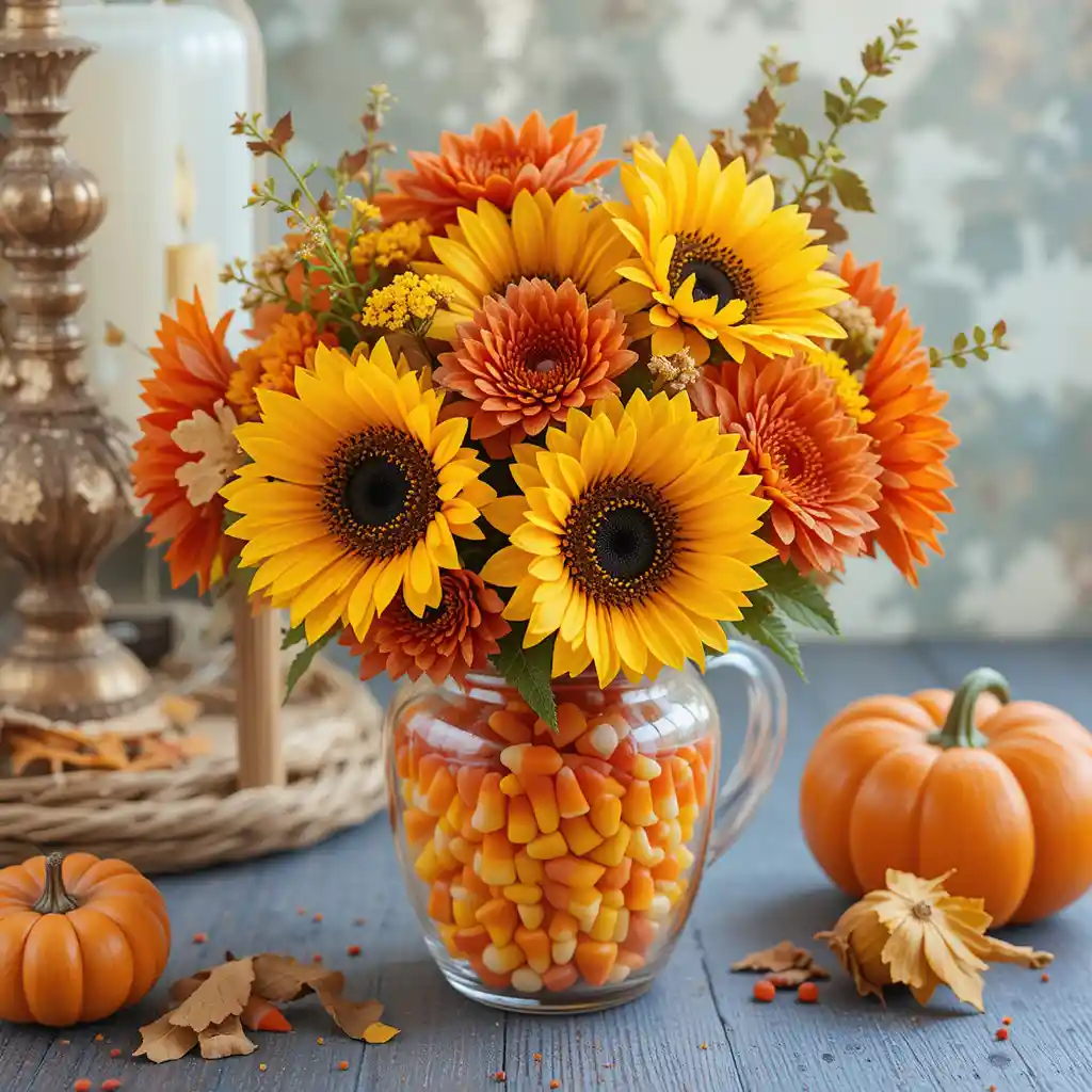 Fill a vase with layers of candy corn and add sunflowers or other fall flowers for a sweet and vibrant centerpiece.