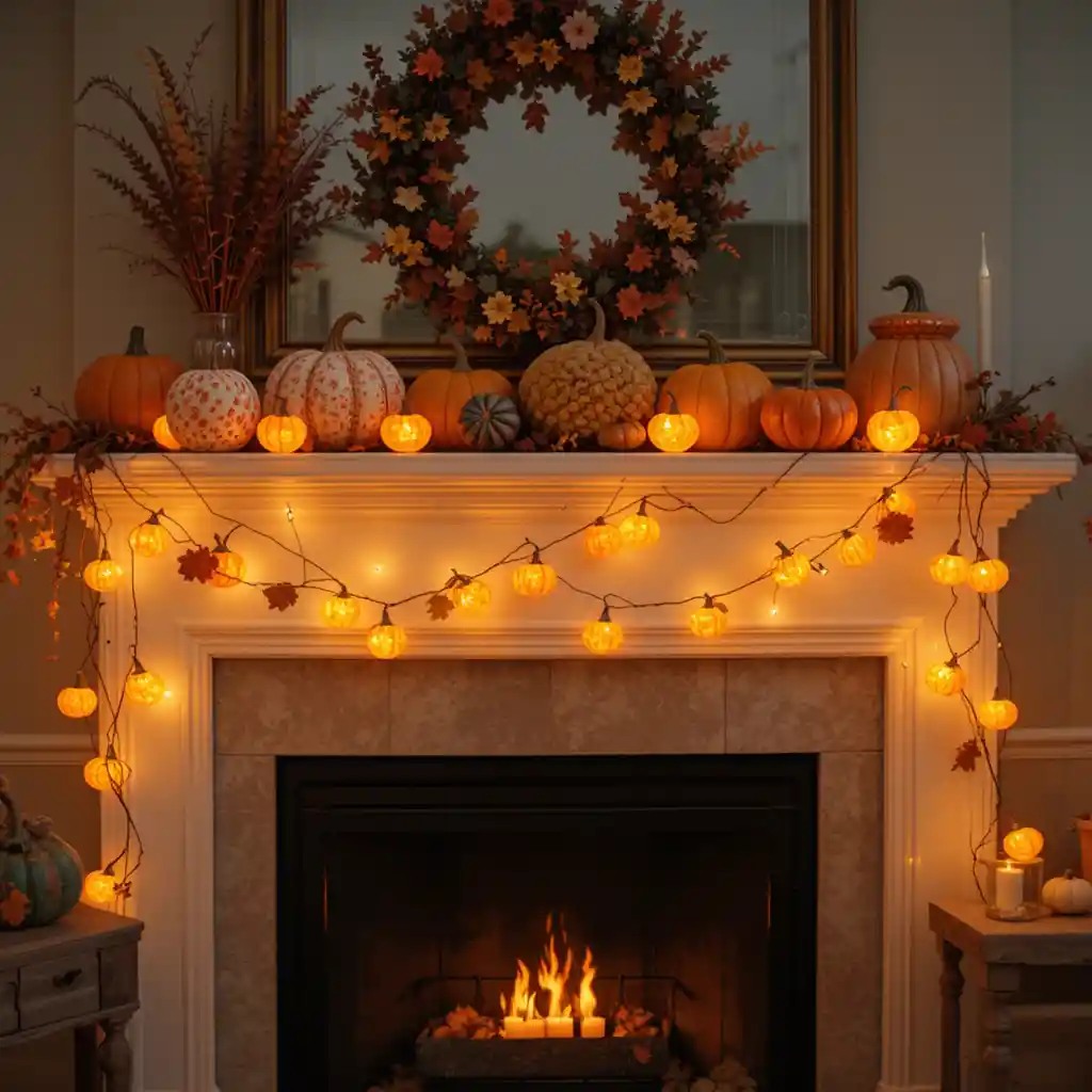 String mini pumpkin-shaped fairy lights across the mantel or around the dining area for a cozy evening glow that kids will love arranging. Thanksgiving Decorations for Kids