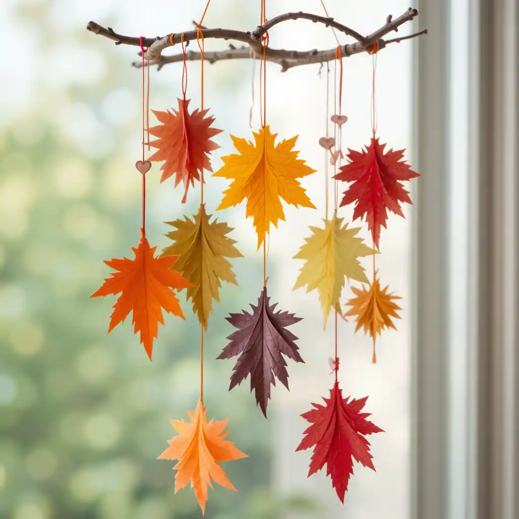Create a mobile with colorful paper leaves hanging from a branch, perfect for window or ceiling decoration.