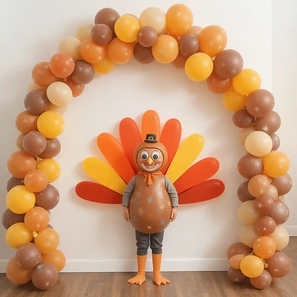 Arrange balloons in brown, orange, and yellow with a turkey face at the center for a fun kids’ photo backdrop.