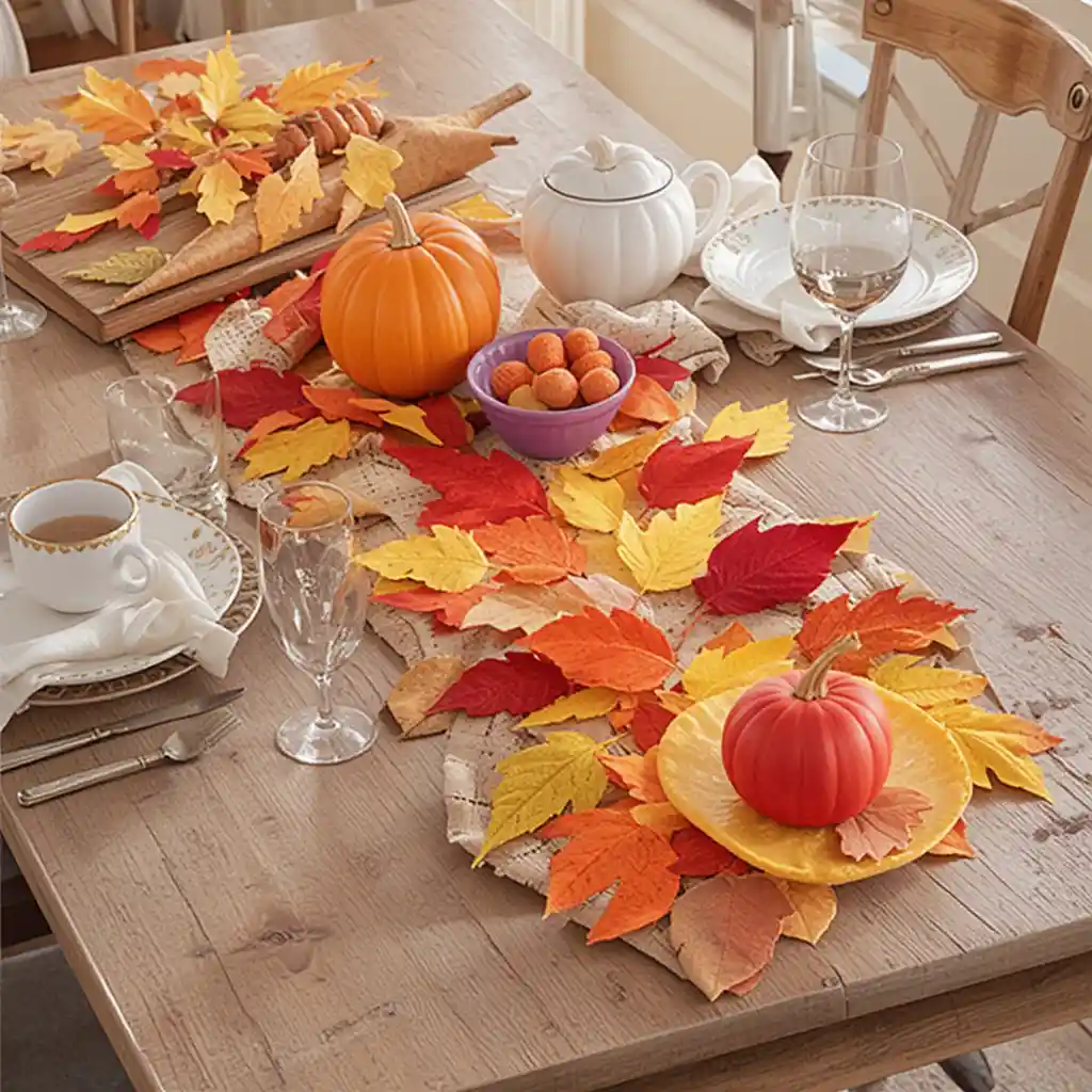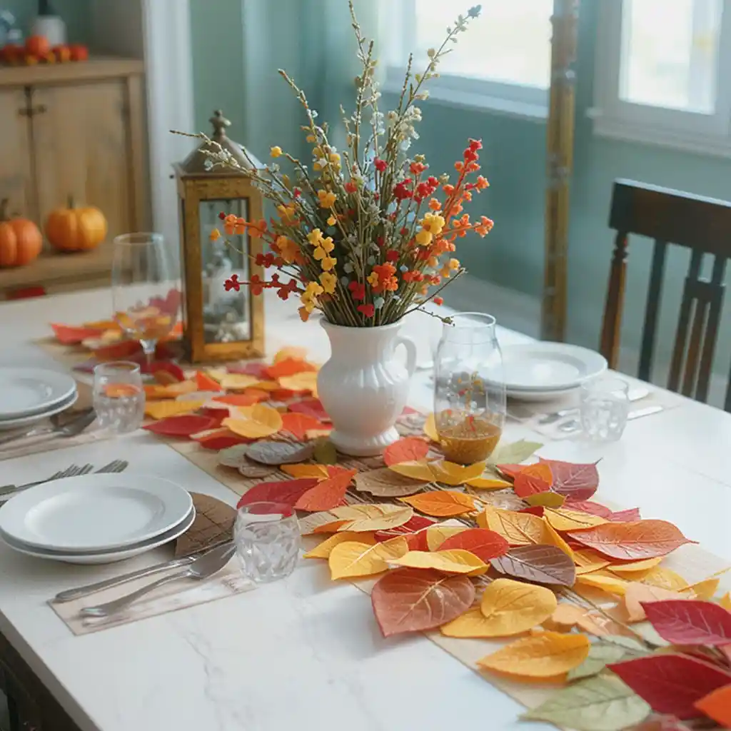 Cut felt leaves in red, yellow, and orange, then stitch or glue them together for a soft, colorful table runner kids can help assemble.