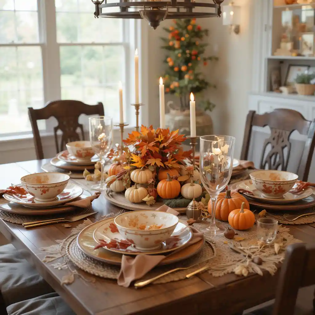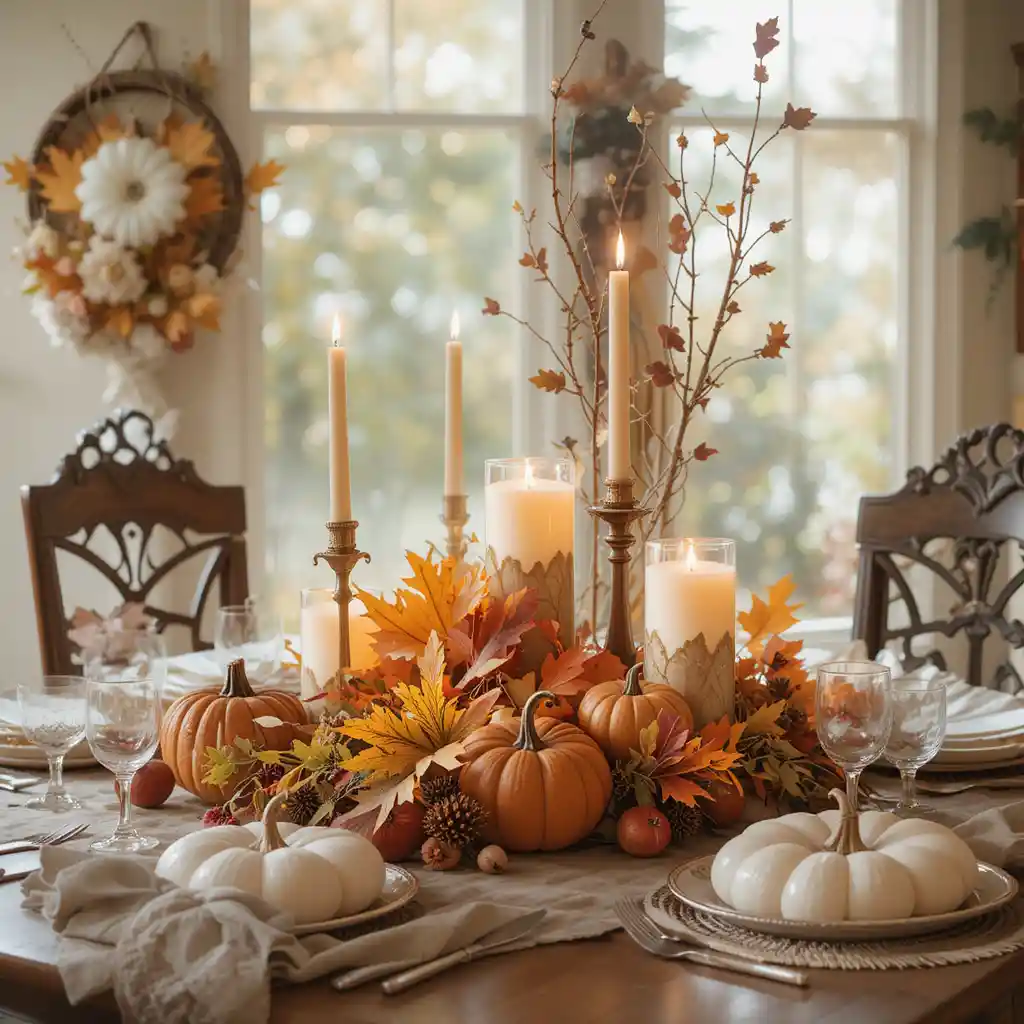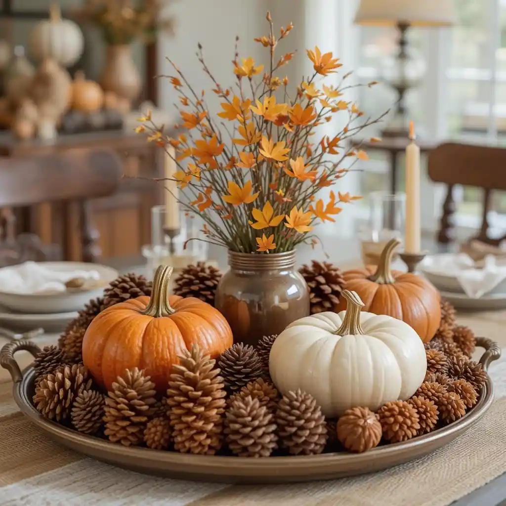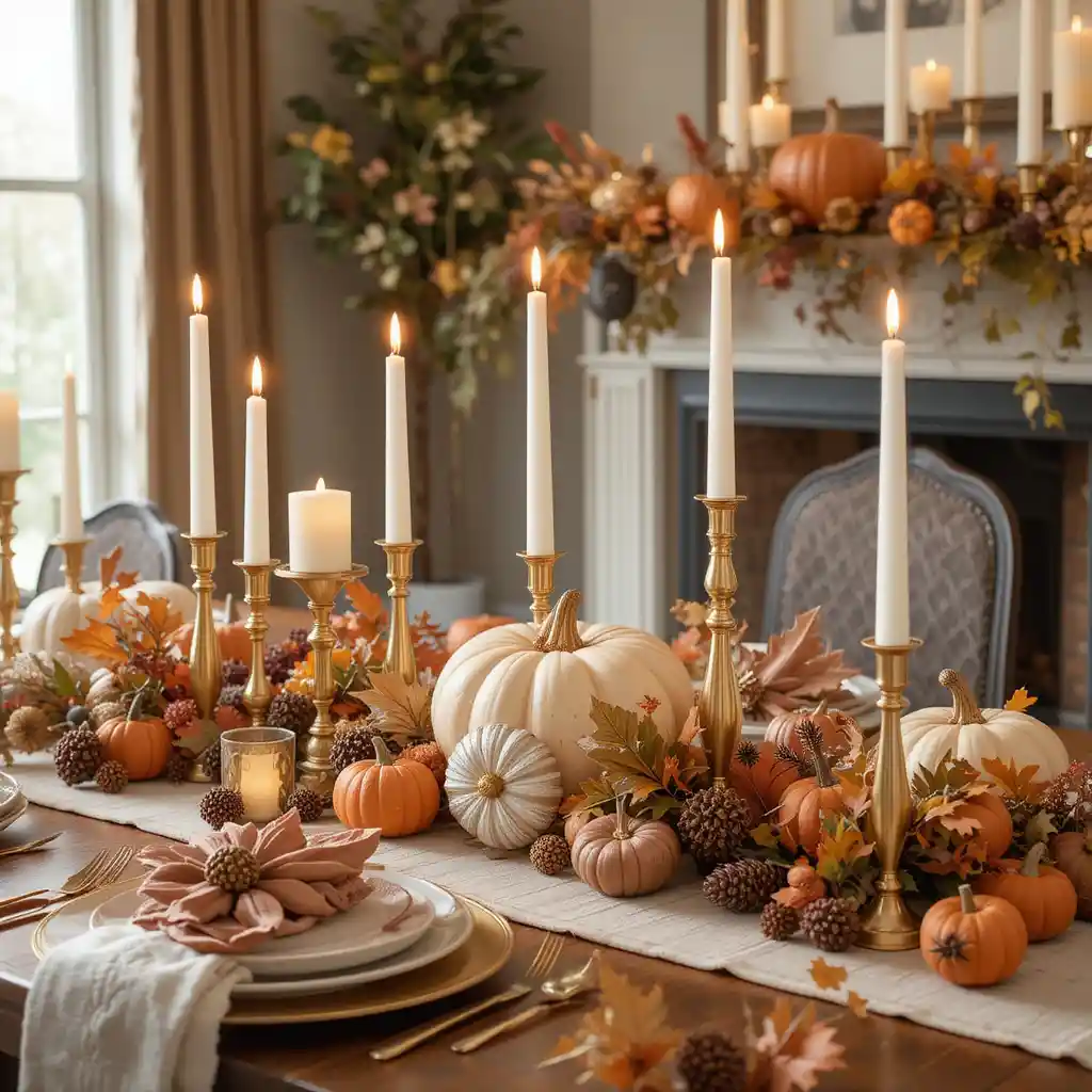 Decorate your table with rustic pumpkin centerpieces in shades of orange, white, and gold. Add greenery, pinecones, or candles around them to bring warmth and charm.