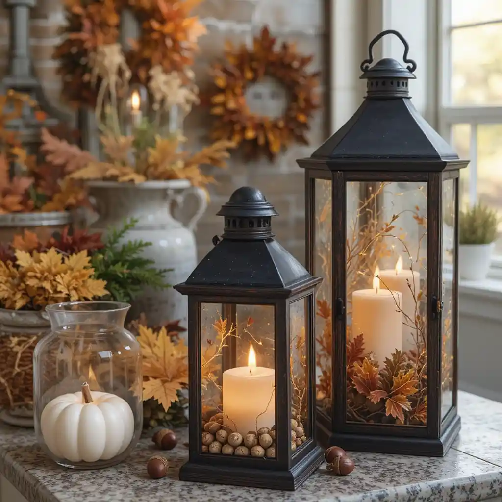 Use lanterns filled with candles, acorns, or fairy lights on porches, tables, or mantels. They bring warmth indoors and out while creating a festive glow.