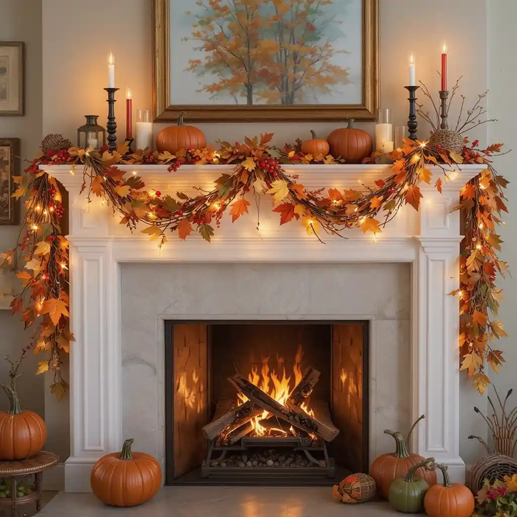 Drape a harvest garland made of faux leaves, berries, and twinkle lights over your mantel. It creates a festive backdrop for family gatherings and holiday photos.
