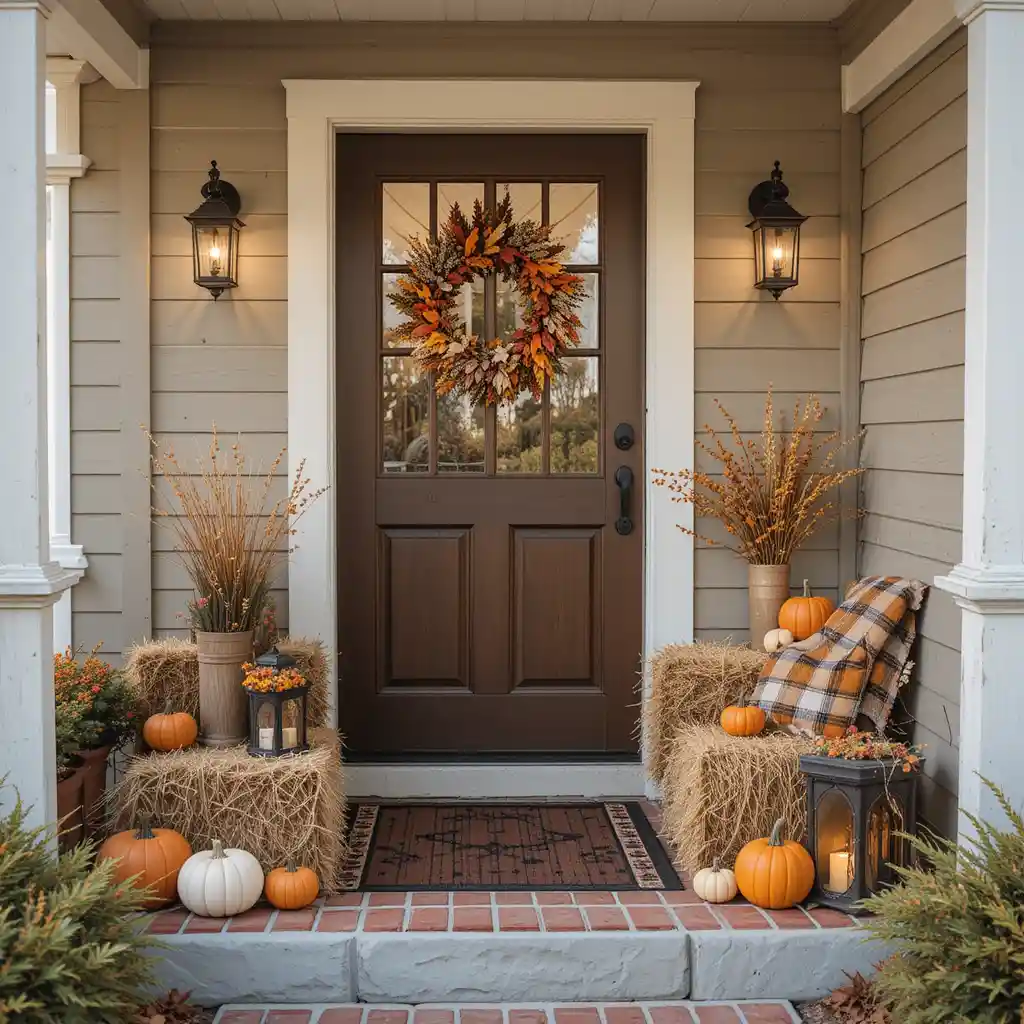 Arrange hay bales, pumpkins, and lanterns on your porch to greet guests with seasonal charm. Add a plaid blanket for an extra welcoming touch.