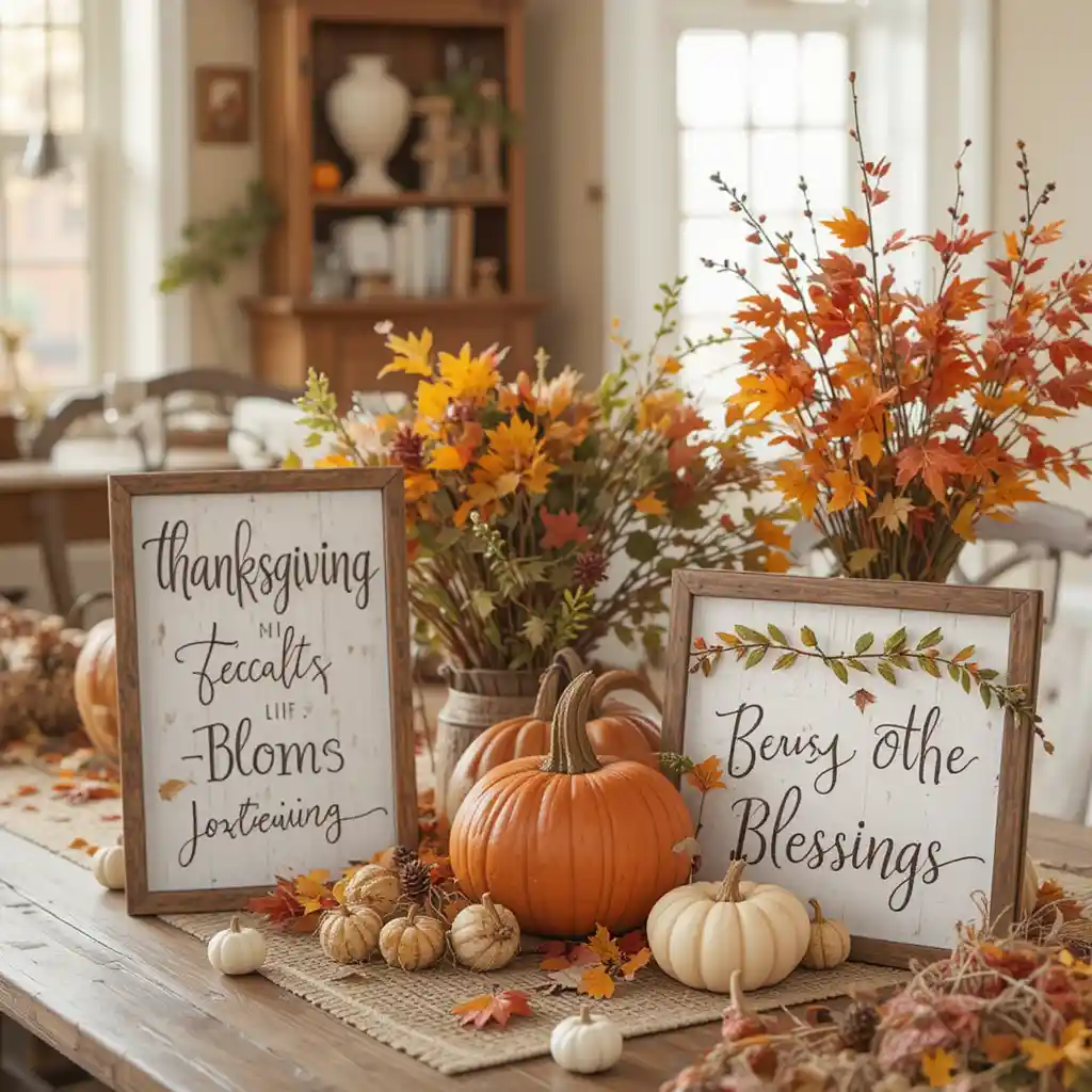 Place farmhouse-style wooden signs with Thanksgiving quotes or blessings around your home. They add a personal and heartfelt touch to your seasonal décor. Thanksgiving Decorations to Create a Warm