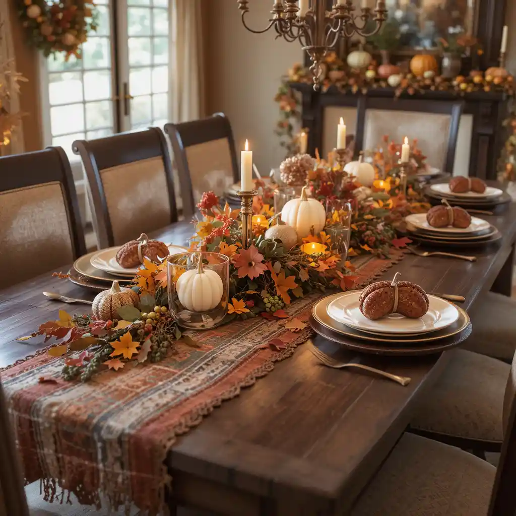 Lay a festive table runner with earthy tones or plaid prints across your dining table. It’s a simple way to add warmth and set the holiday mood.