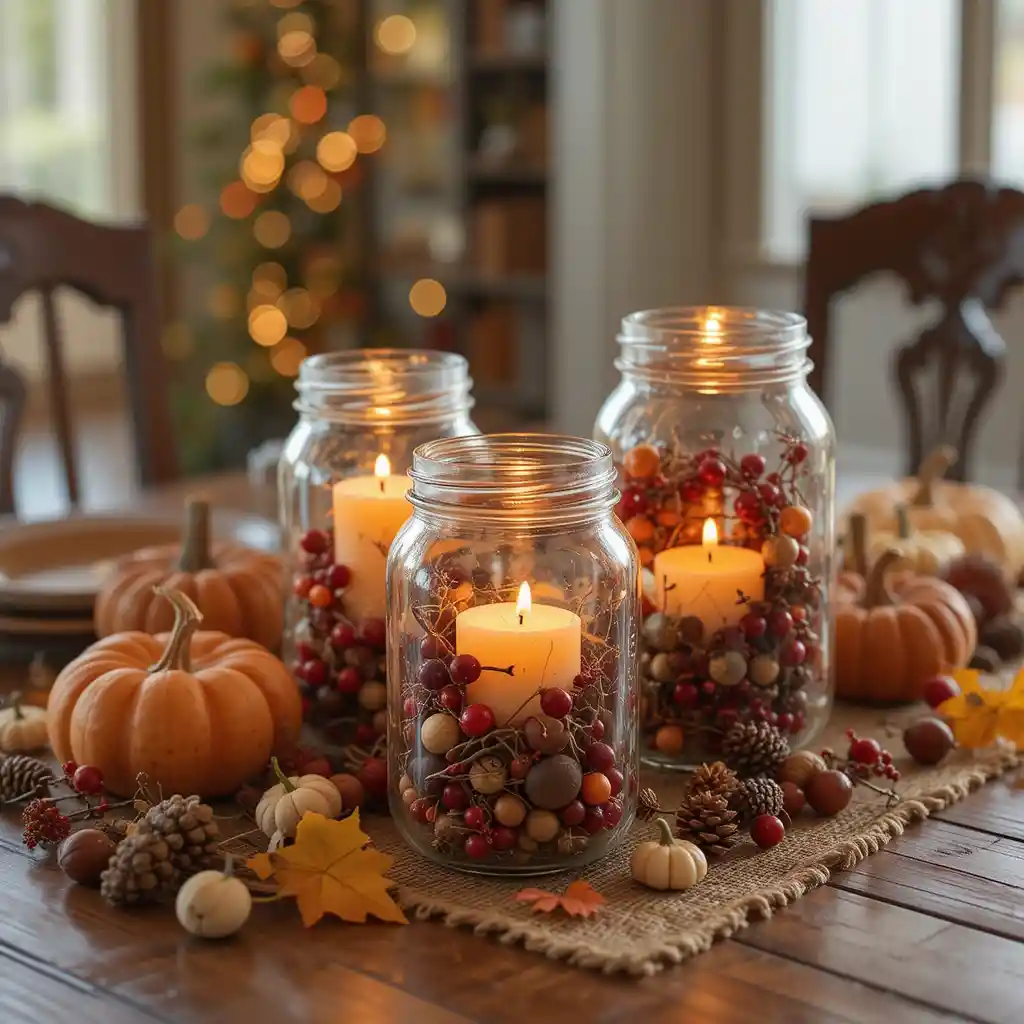 Fill mason jars with candles surrounded by cranberries, acorns, or mini pumpkins. These glowing accents create a cozy atmosphere for Thanksgiving dinner.