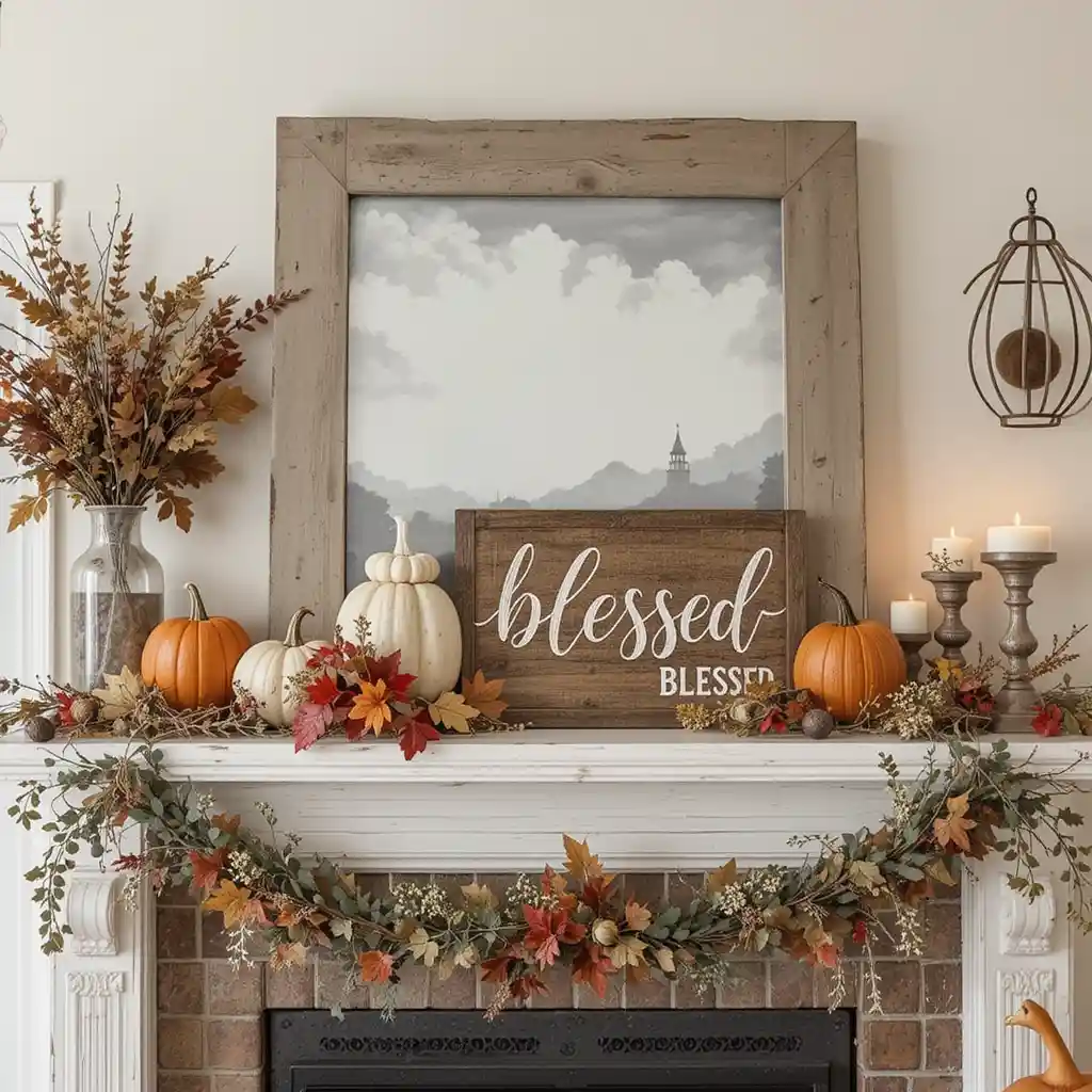Adding rustic wooden signs with words like Thankful, Grateful, Blessed instantly sets the Thanksgiving mood. These signs bring charm, warmth, and a farmhouse vibe to your mantle, making it feel inviting and personal. Thanksgiving Mantle Decorations