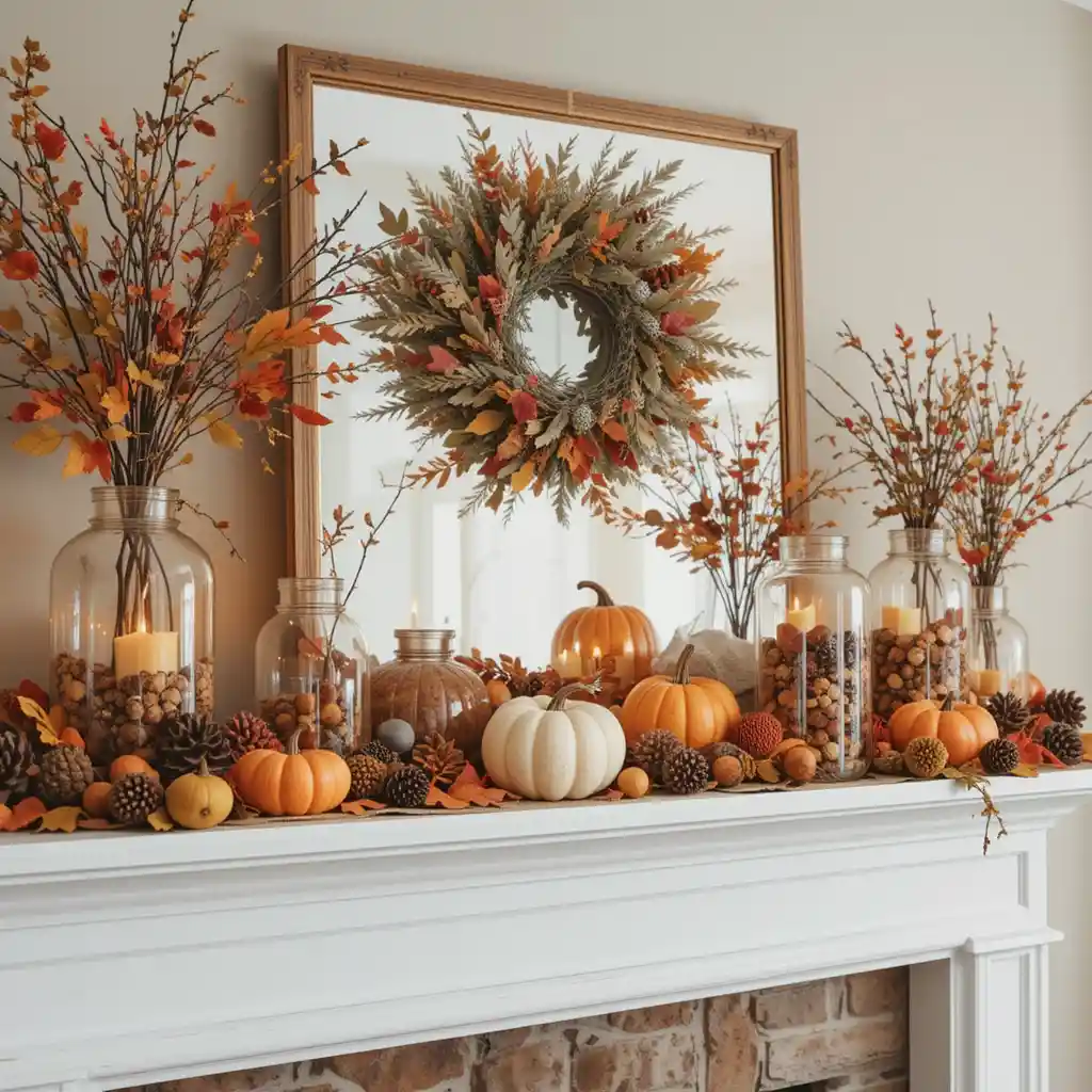 Fill clear jars or vases with pinecones and acorns to create simple yet striking mantle accents. These natural elements bring texture and seasonal charm to the setup. Thanksgiving Mantle Decorations