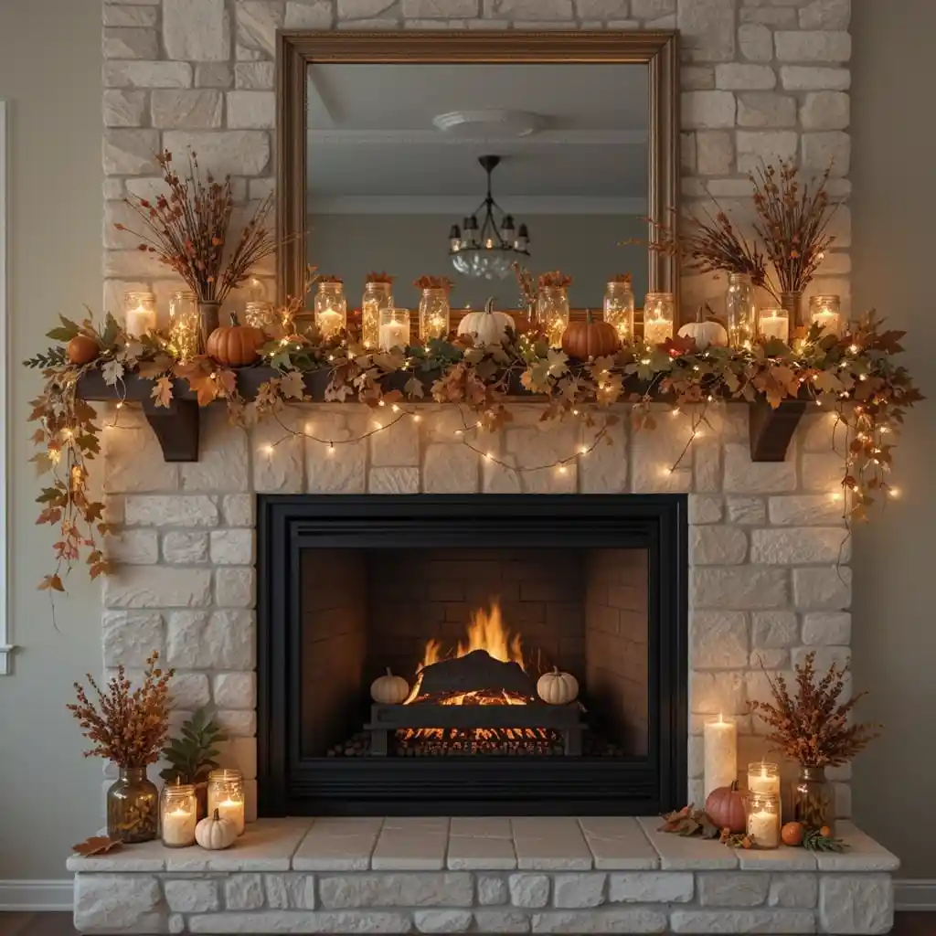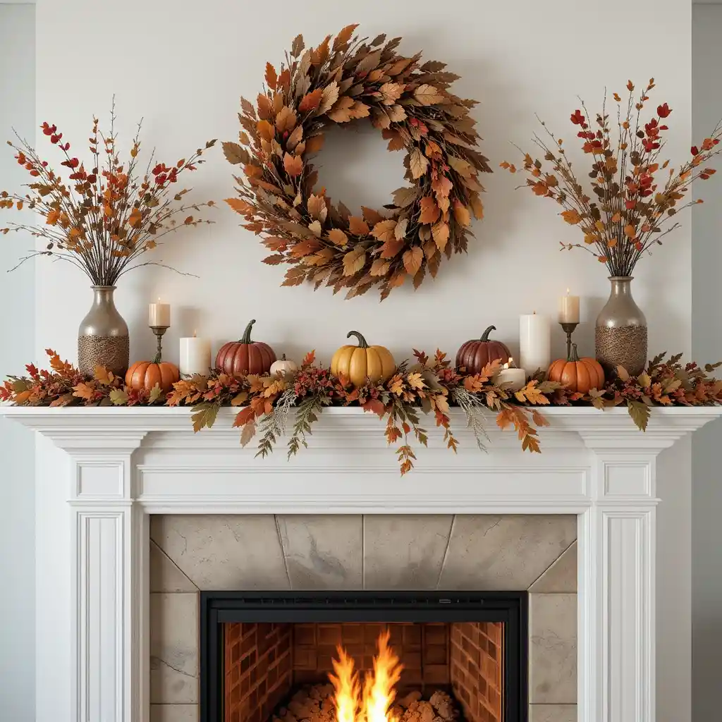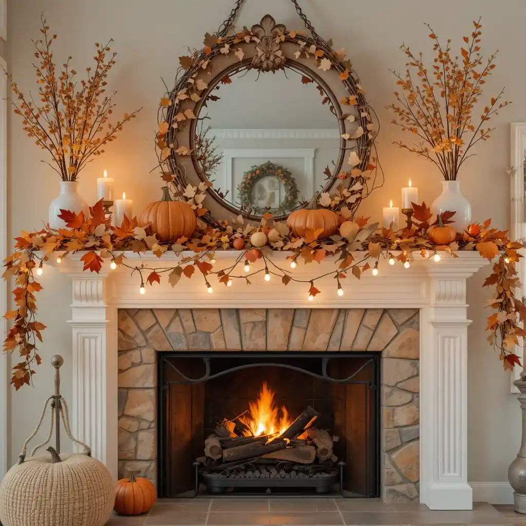 A garland made of artificial or real fall leaves draped across the mantle creates a beautiful natural look. The warm orange, red, and yellow tones bring a seasonal touch that reflects the beauty of autumn.