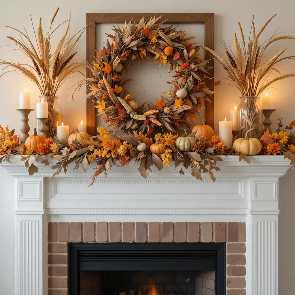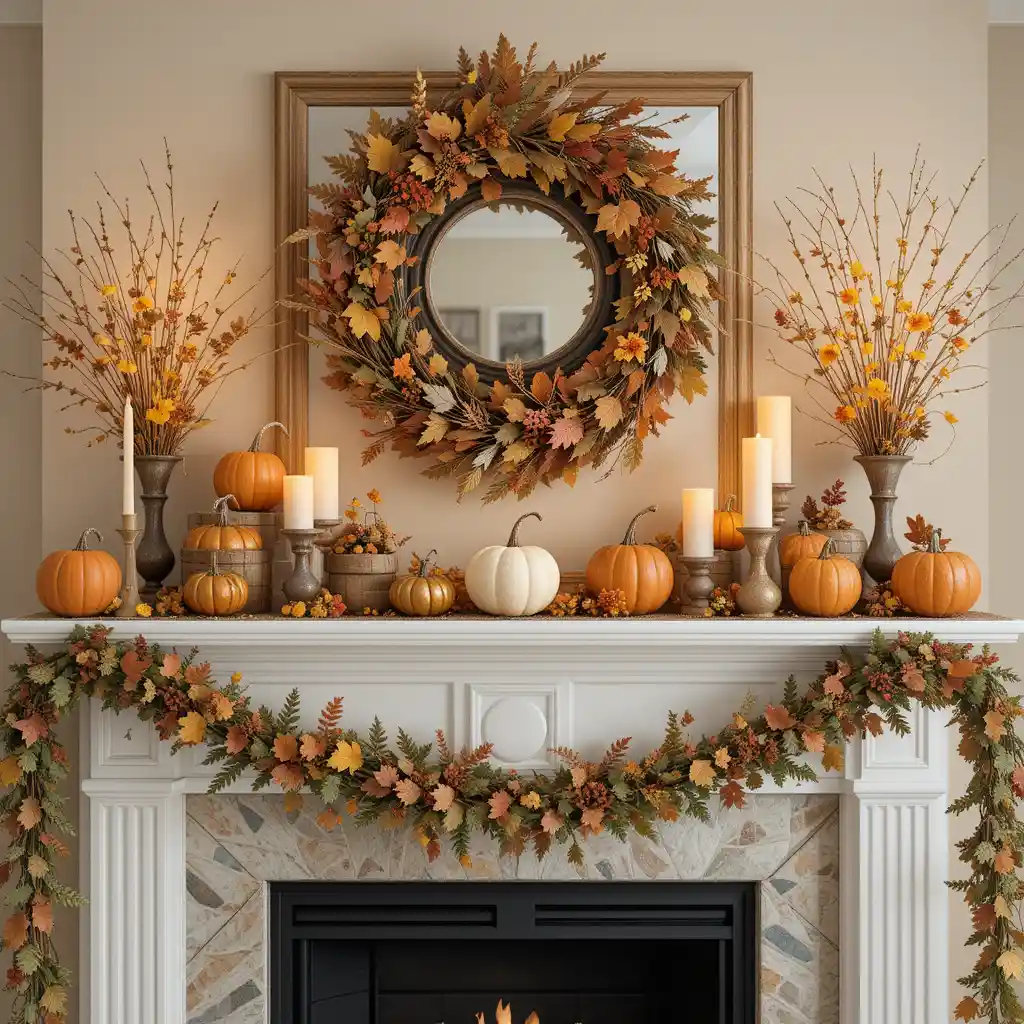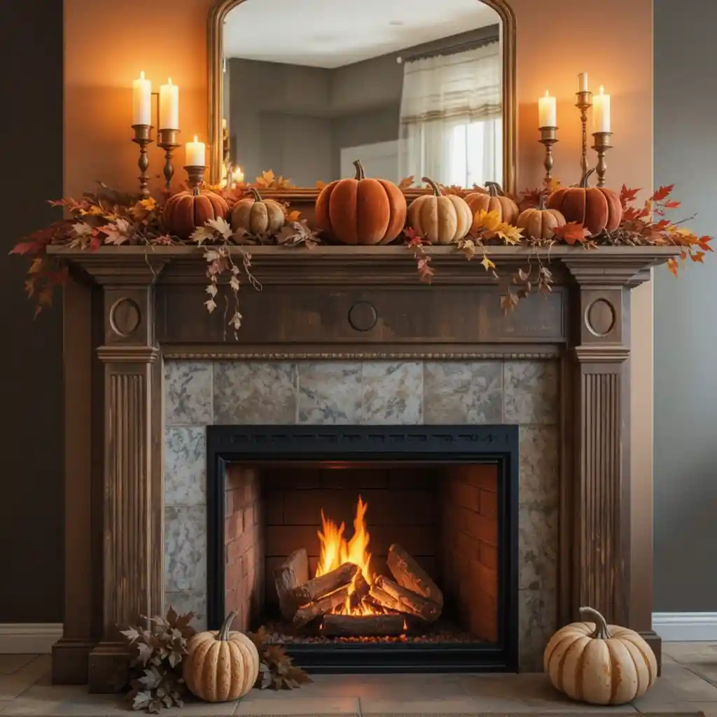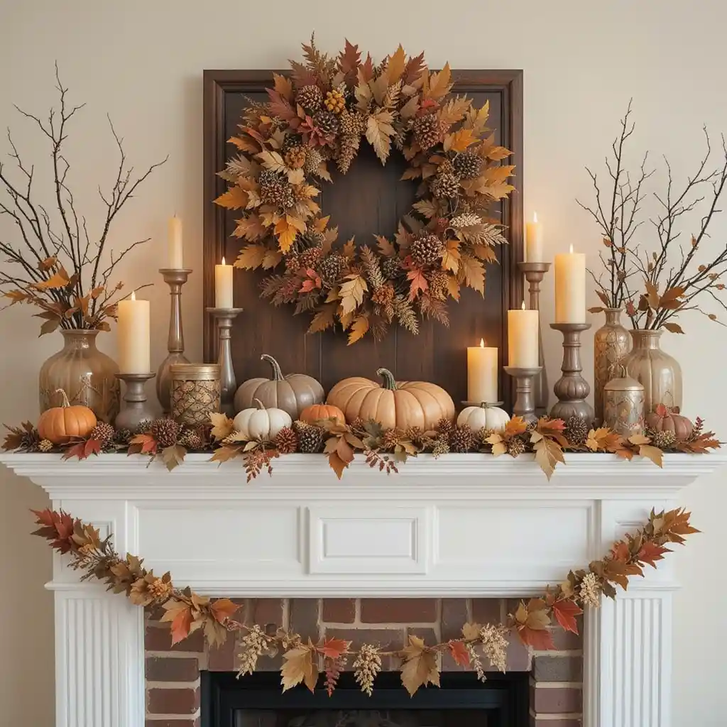 A garland made of artificial or real fall leaves draped across the mantle creates a beautiful natural look. The warm orange, red, and yellow tones bring a seasonal touch that reflects the beauty of autumn.