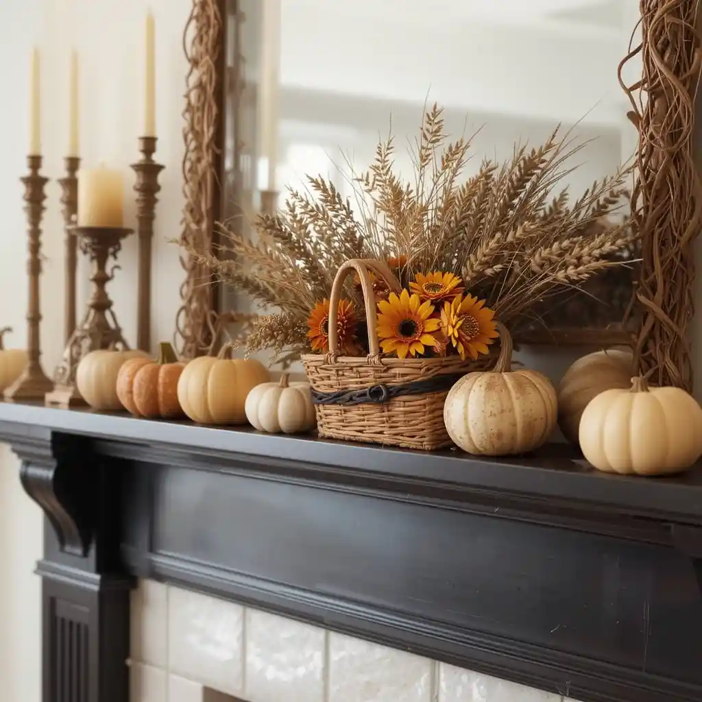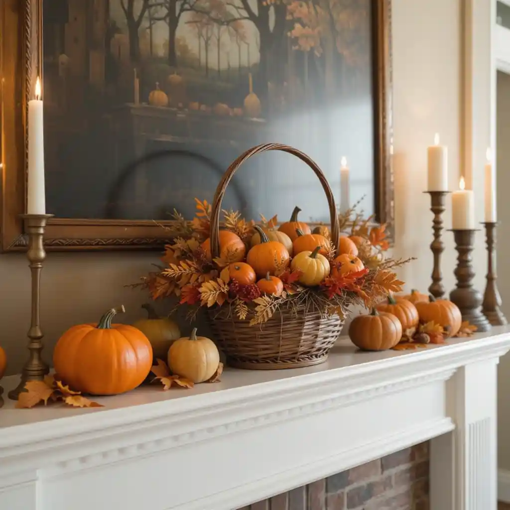 Place a harvest basket filled with gourds, apples, and leaves in the center of the mantle. This creates a warm focal point and celebrates the season’s bounty.