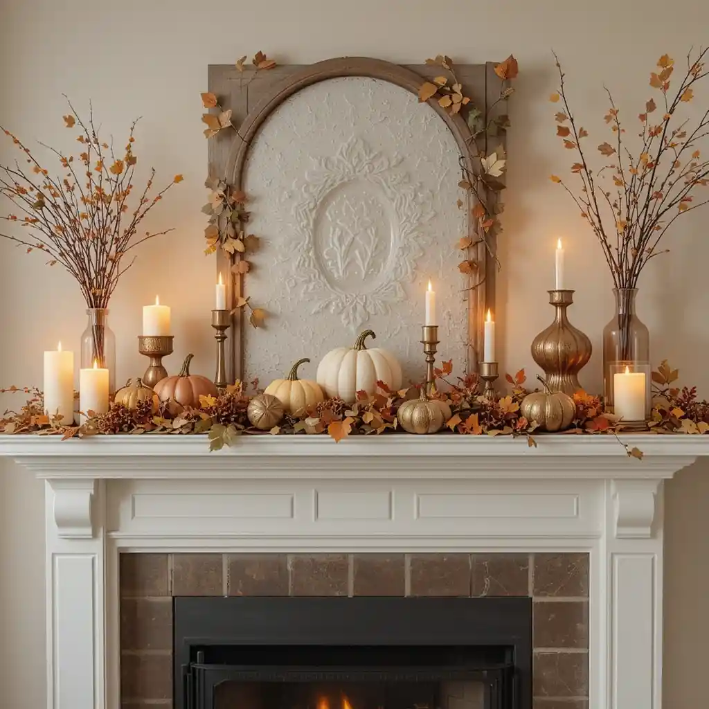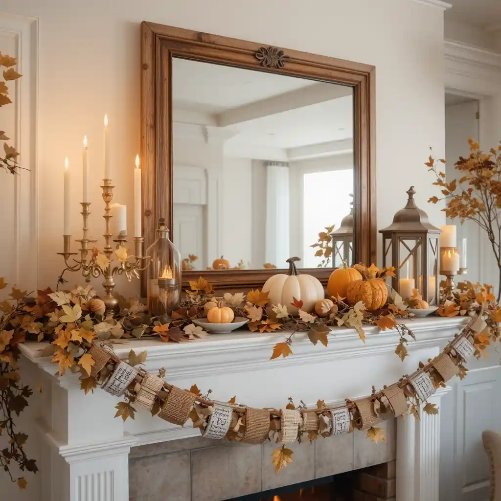 Use layered mirrors and empty frames to give your mantle depth and dimension. Add fall accents like leaves or garlands around them to tie everything into the Thanksgiving theme. Thanksgiving Mantle Decorations