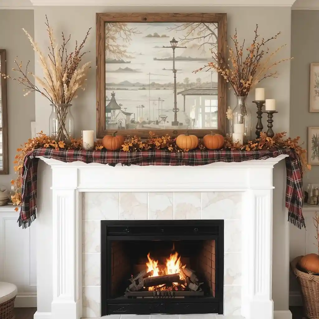 Lay a plaid fabric runner or scarf across the mantle for a soft, textured background. It introduces a cozy, layered look while highlighting traditional fall patterns. Thanksgiving Mantle Decorations