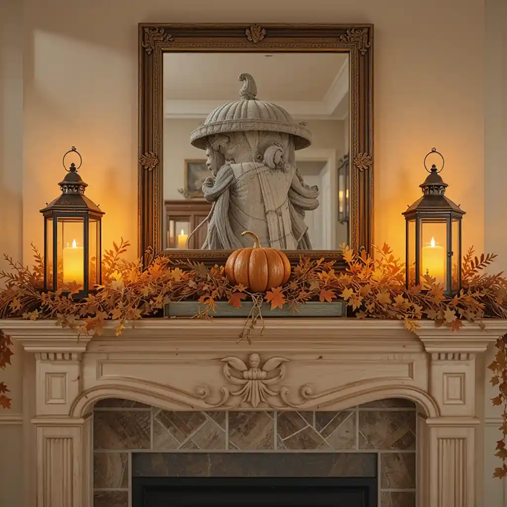 Use lanterns filled with LED or real candles to add warmth and rustic charm. Position them at both ends of the mantle for a balanced, glowing effect.