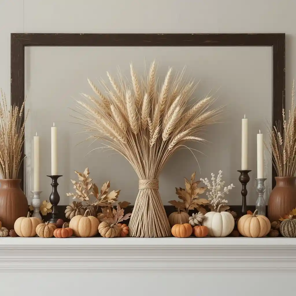 Bundle together wheat sheaves tied with twine or ribbon and place them on the mantle. They bring a farmhouse feel while symbolizing harvest and gratitude.