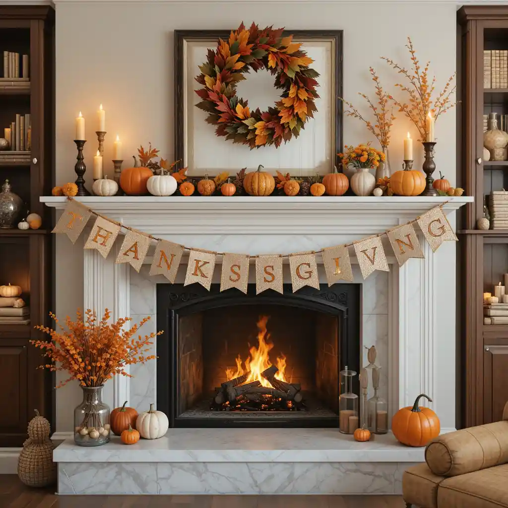 Hang a “Happy Thanksgiving” banner across your mantle for an instant festive upgrade. Burlap, wood, or glitter letters can match different décor styles while making the fireplace the center of attention. Thanksgiving Mantle Decorations