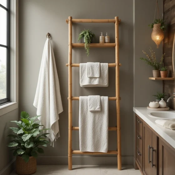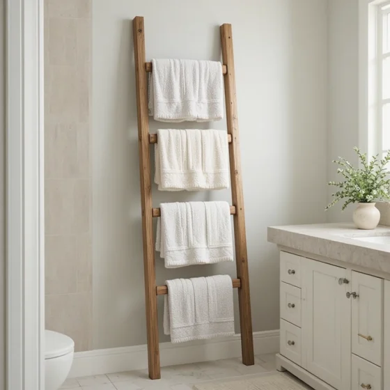 Give your bathroom a cozy and organic touch with a wooden ladder towel rack. Lean it casually against the wall to create a relaxed farmhouse look. This not only saves space but also allows you to hang multiple towels stylishly Towel Rack Styling