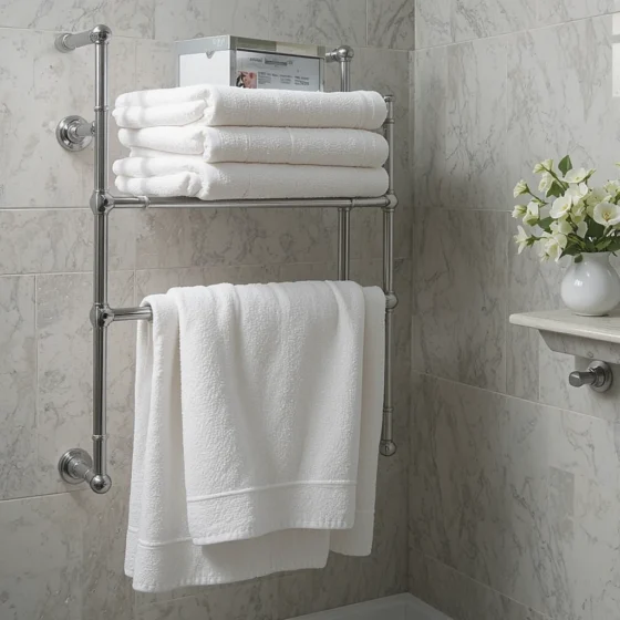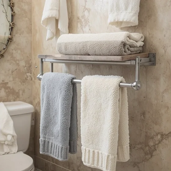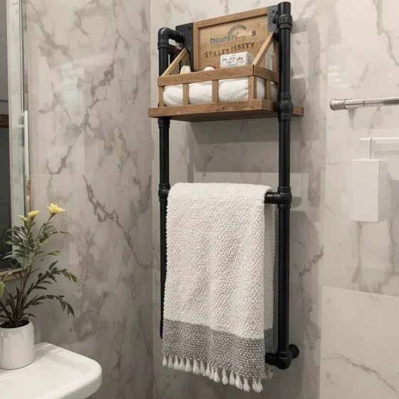 If you love an urban or minimalist aesthetic, use black metal pipe racks. They add a bold industrial edge to your space while staying practical. Pair them with white or gray towels for a clean and balanced finish.
