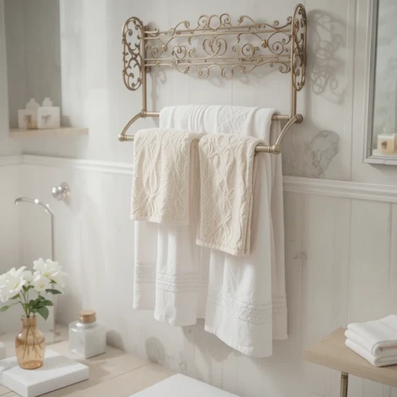 Go vintage with decorative wall brackets as towel holders. Brass, bronze, or antique finishes can add charm and personality to your bathroom. Match them with patterned or fringed towels for that perfect nostalgic style.