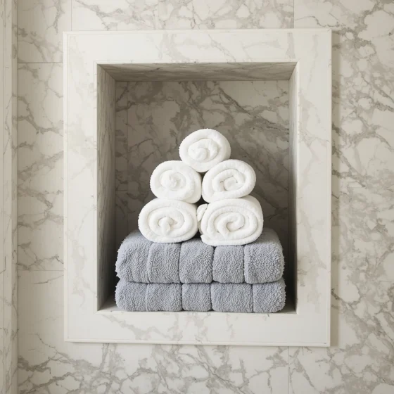 For a sleek, custom design, install a built-in towel niche in your wall. It saves floor space and creates a seamless look. Roll your towels neatly to give a spa-inspired, organized appearance.