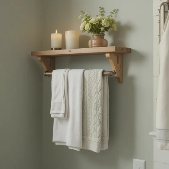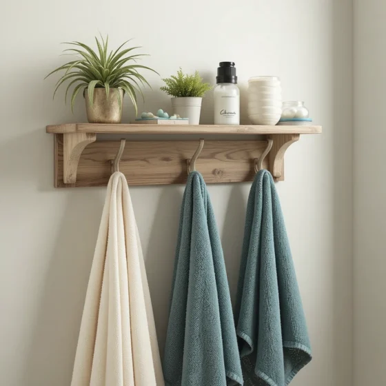 A wall-mounted towel rack with hooks offers the best of both worlds. Hang your towels neatly while using the top shelf to display decorative items like candles, plants, or essential oils for a personalized touch.