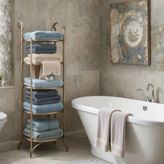 Add a freestanding tiered towel rack near your bathtub for a spa-like atmosphere. Its layered design lets you display plush towels beautifully, giving your bathroom a touch of elegance and relaxation.