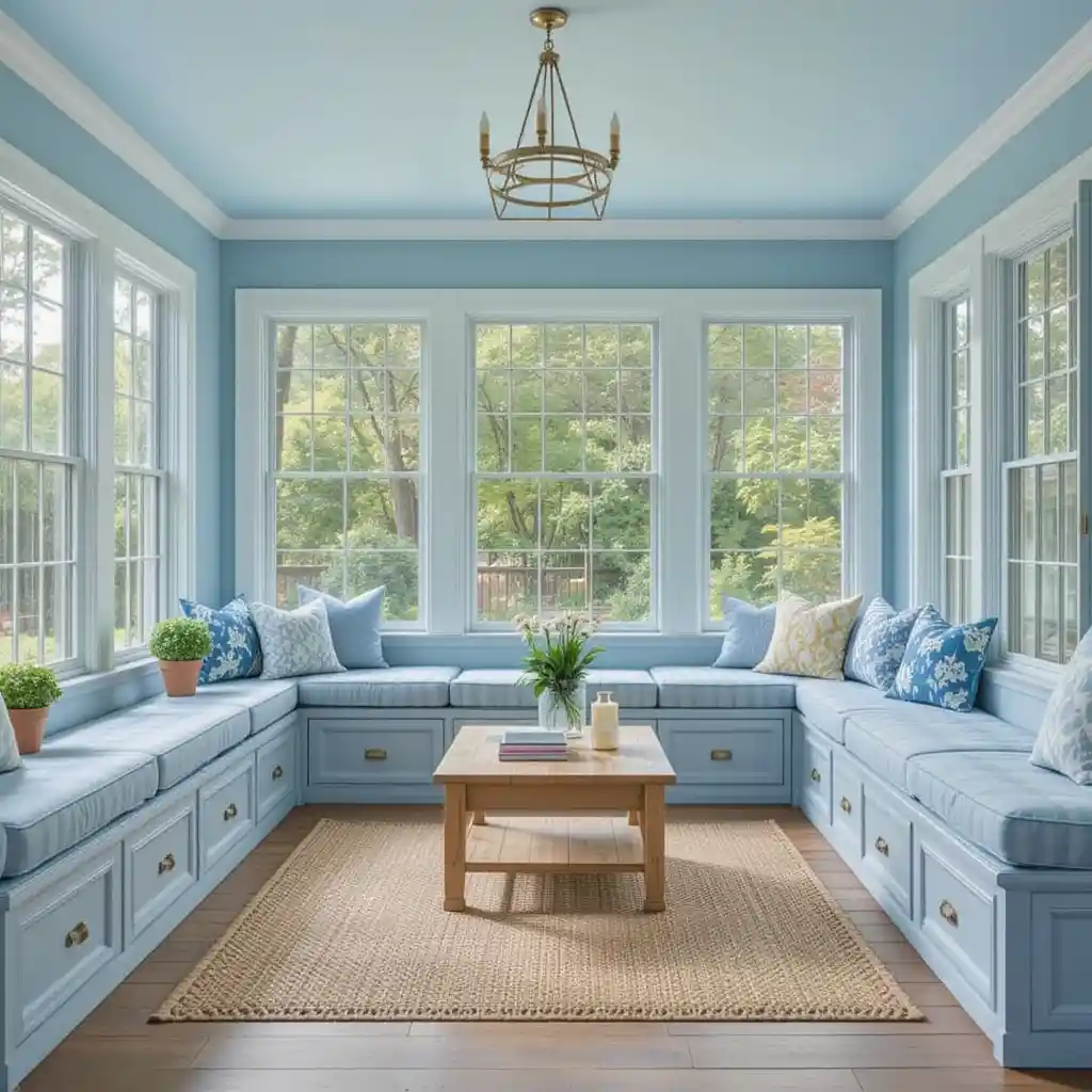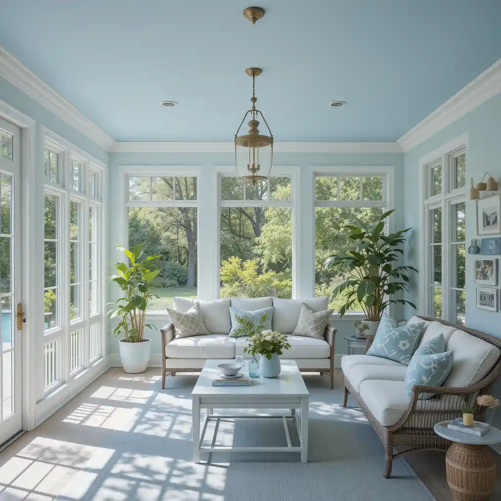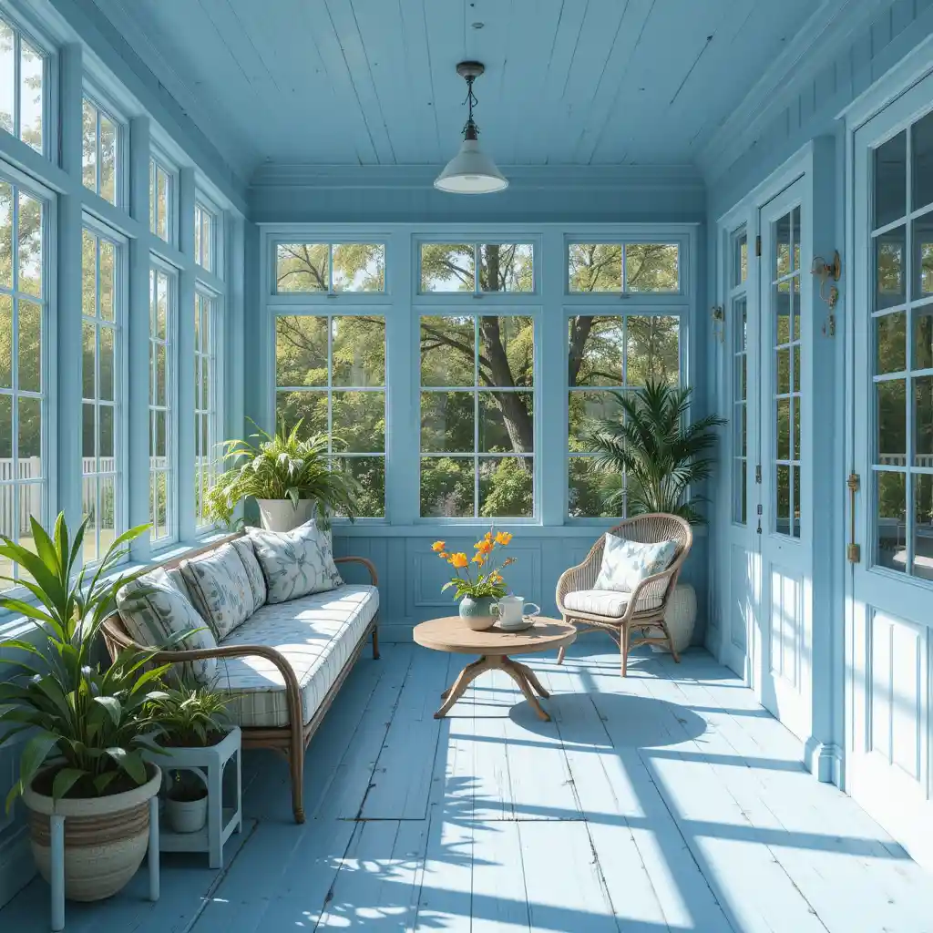 Painting the walls in a soft sky blue sets a peaceful tone for the entire space. This shade enhances natural light and gives your sunroom an airy, open feel. Blue Sunroom Ideas