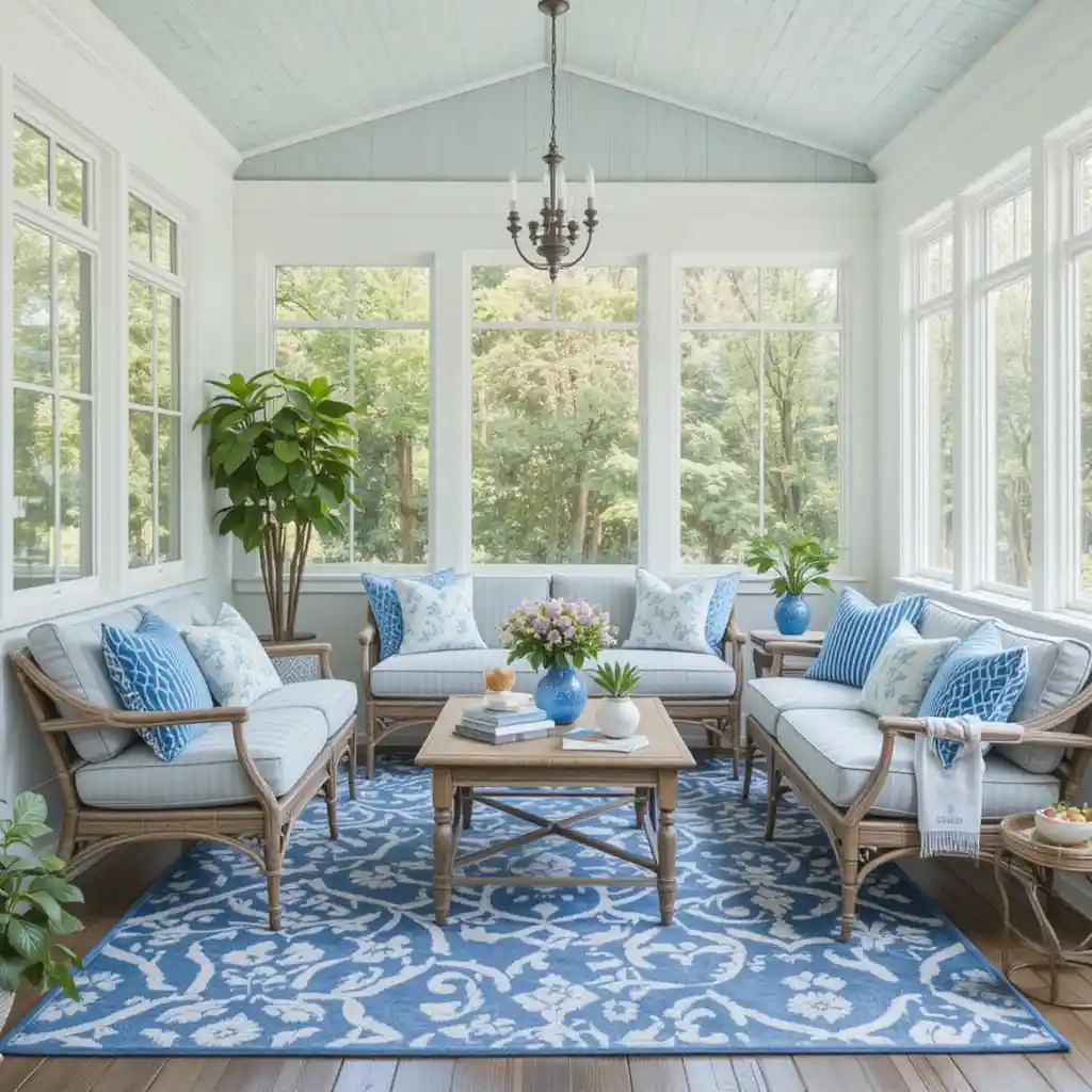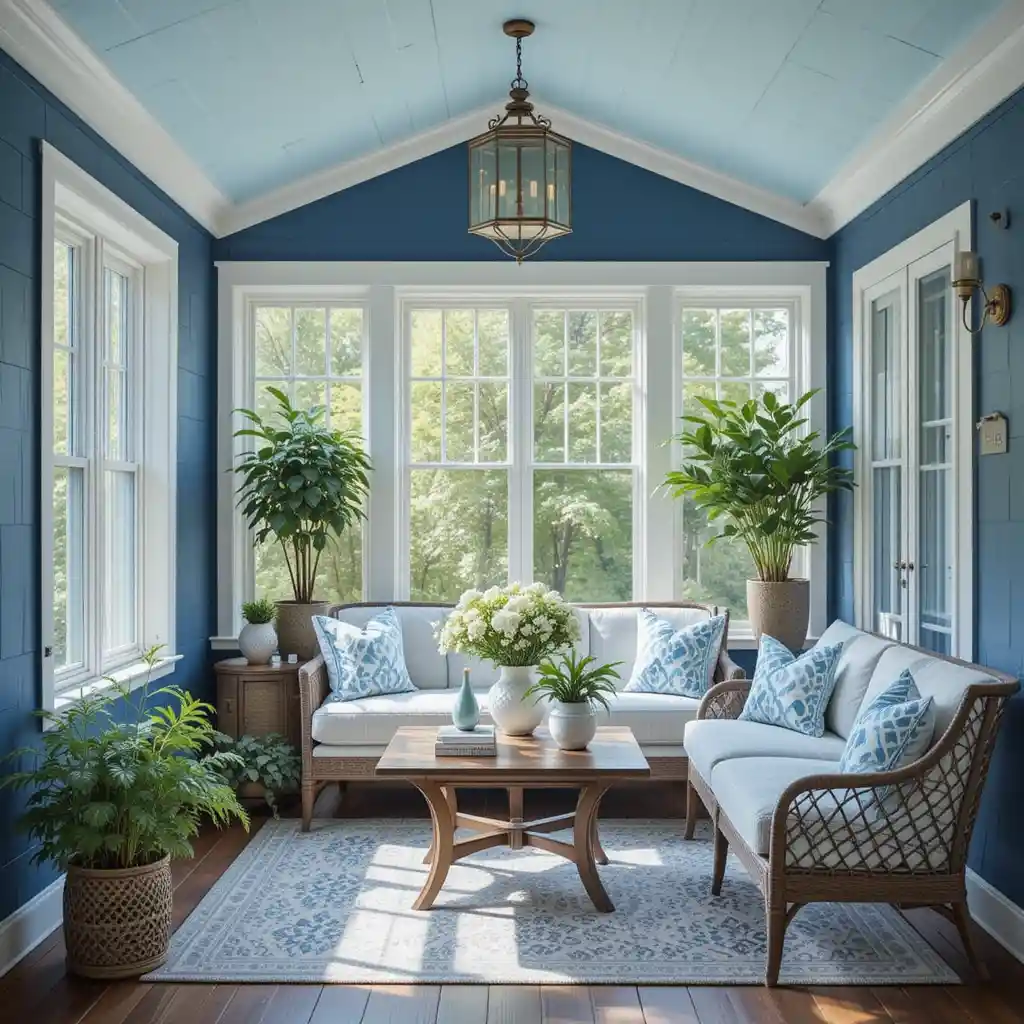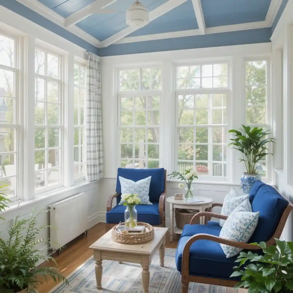 Use two-tone furniture—white frames with deep blue cushions—to create contrast while maintaining a light, airy vibe. Blue Sunroom Ideas