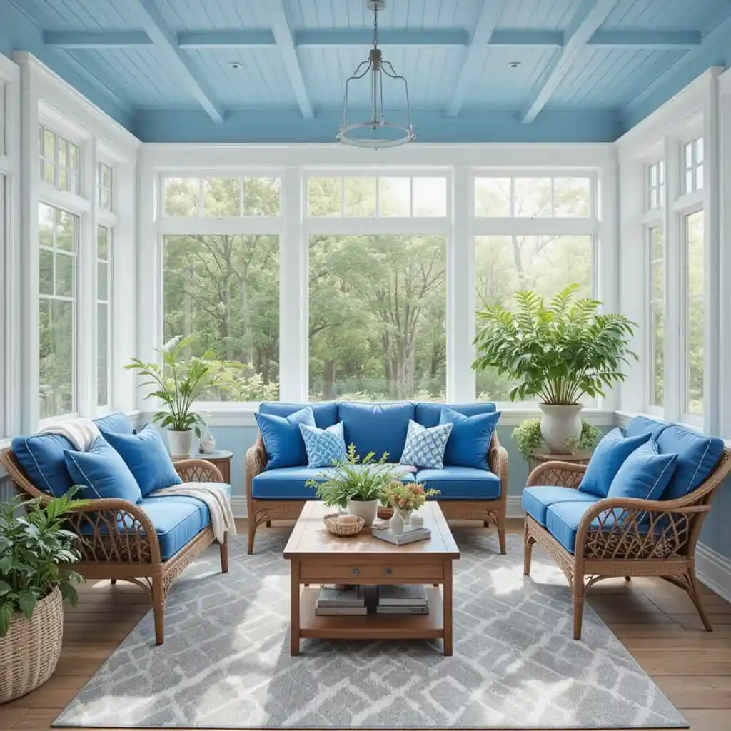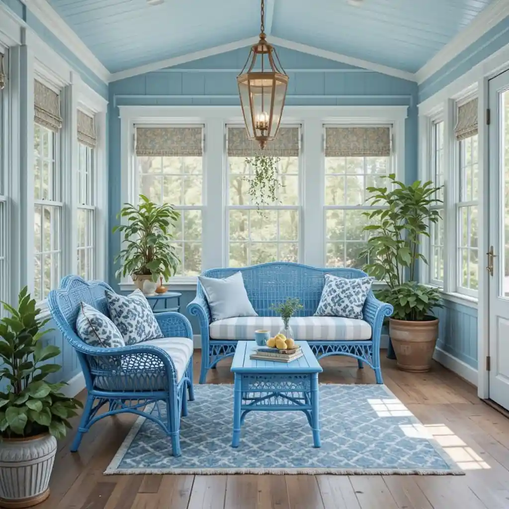 Opt for blue-painted wicker chairs or loveseats for a rustic-meets-chic vibe. They’re perfect for farmhouse or cottage-style homes. Blue Sunroom Ideas
