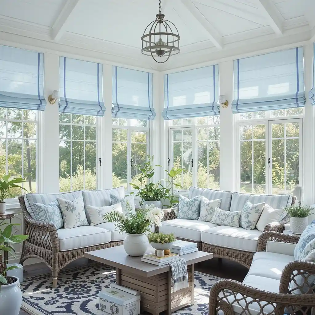 Use striped curtains in light blue and white to echo a breezy beachside atmosphere. They also help control sunlight without overpowering the space. Blue Sunroom Ideas