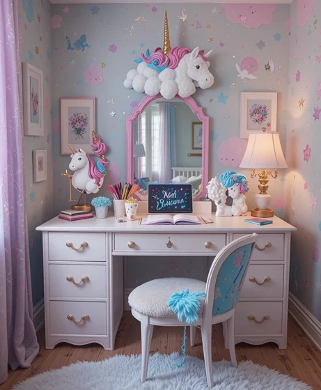 Add unicorn desk accessories like pencil holders, mirrors, or lamps. This creates a fun yet focused study or beauty corner. It encourages creativity while keeping the space functional.