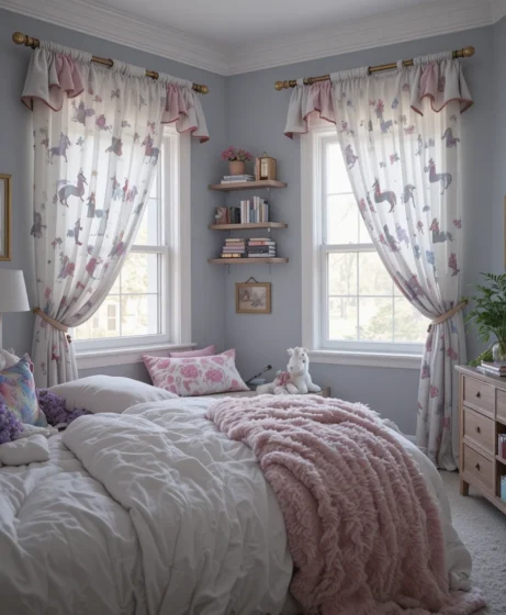 Soft unicorn-print curtains frame windows beautifully. Light fabrics allow natural light while adding charm. Subtle designs work best for a polished look.