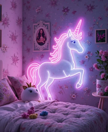 Unicorn-shaped neon lights add a modern glow while keeping the fantasy alive. Soft pink or warm white lighting creates a cozy nighttime vibe. It also doubles as a fun night light for kids’ bedrooms Unicorn Room Décor.
