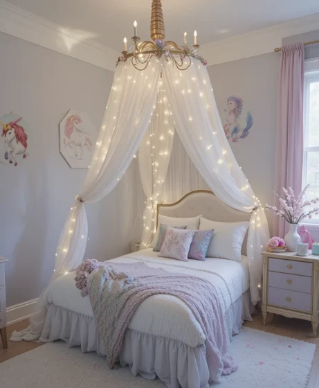 Adding a sheer canopy over the bed makes the room feel like a fairy tale. Pair it with tiny star lights and unicorn clips for a magical sleeping experience. This idea adds height and elegance without heavy décor.