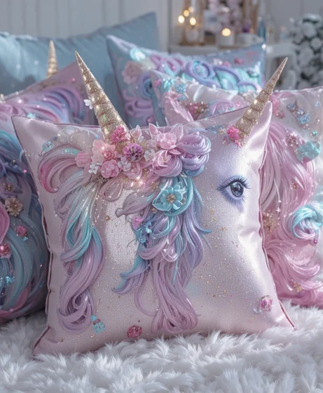 Unicorn pillows in shimmer or velvet fabrics bring texture and comfort. They’re perfect for beds, reading corners, or accent chairs. This is an easy way to update the theme without changing the entire room.